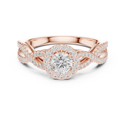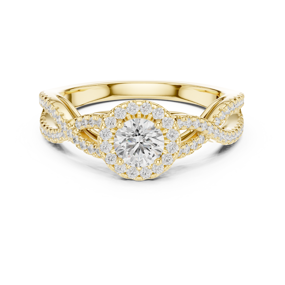 This captivating engagement ring features a round brilliant cut diamond at the center, encircled by a luminous halo that enhances its size and sparkle. The band flows into an elegant twisted split design, delicately lined with pavé-set diamonds that create continuous brilliance along the shoulders. The graceful symmetry and intertwined structure add depth, dimension, and a refined romantic character while maximizing light reflection from every angle.