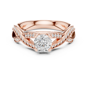 This elegant engagement ring showcases a captivating round brilliant cut diamond at its center, secured in a classic prong setting for maximum light exposure. The band flows into a graceful twist silhouette, creating a split shank profile lined with shimmering pavé-set diamonds. The open, airy structure enhances brilliance while adding depth, symmetry, and refined dimension to the design, resulting in a timeless yet modern statement piece.