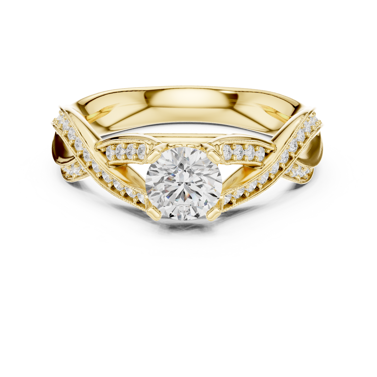 - Side stones: Pavé-set round diamonds along twisted split shank