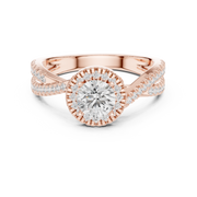 This refined engagement ring showcases a round brilliant cut diamond in a classic prong setting, elevated to capture maximum light and brilliance. The band flows into an elegant twist split-shank silhouette, where delicate rows of diamonds trace each side for added sparkle and dimension. The graceful crossover design creates beautiful symmetry and depth, giving the ring a modern yet timeless presence.
