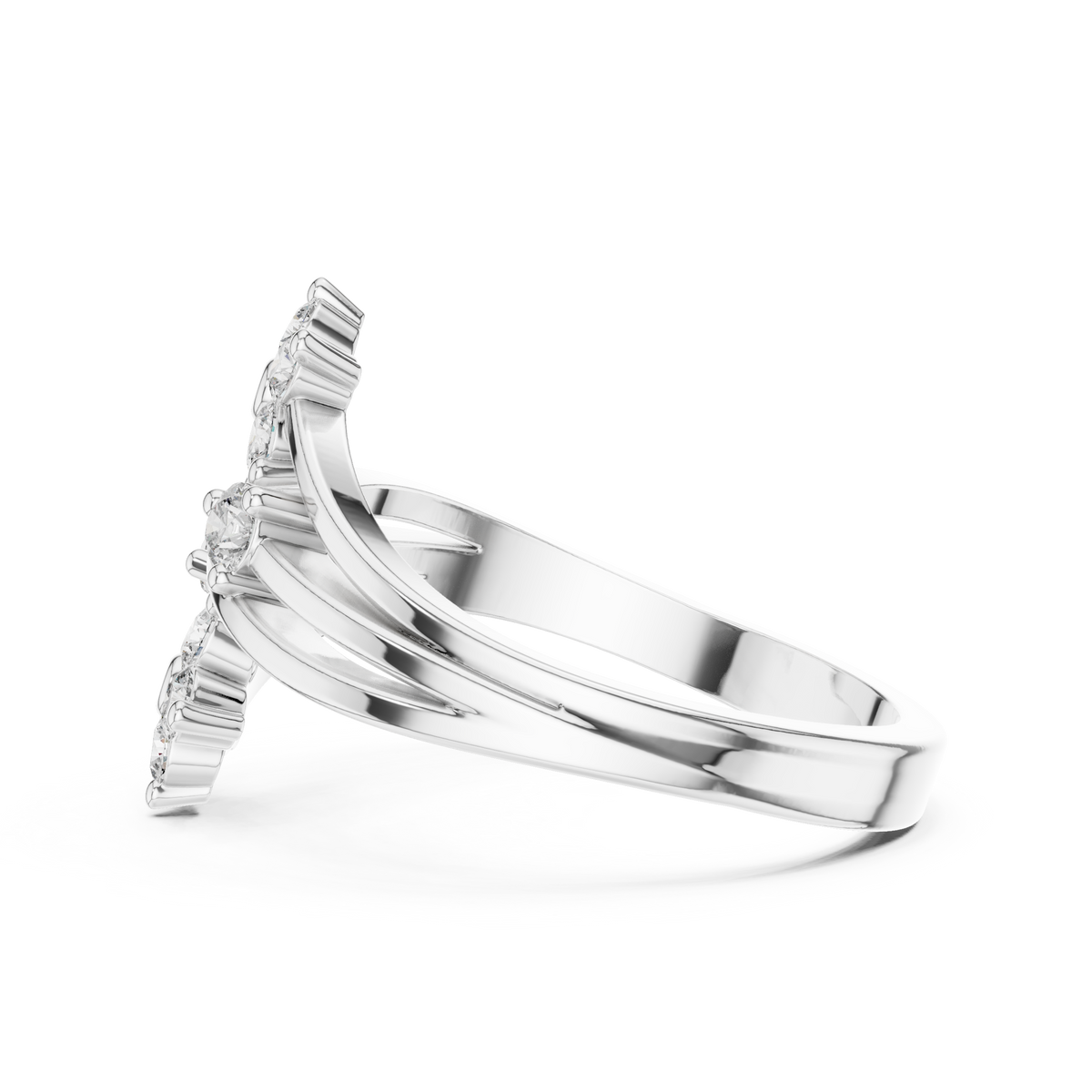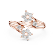 This elegant diamond ring showcases a graceful bypass open-band design adorned with floral-inspired diamond clusters. Round cut diamonds are arranged in balanced flower motifs, creating soft symmetry and visual depth. The flowing open structure adds movement and dimension, while the polished bands enhance overall brilliance and refinement.