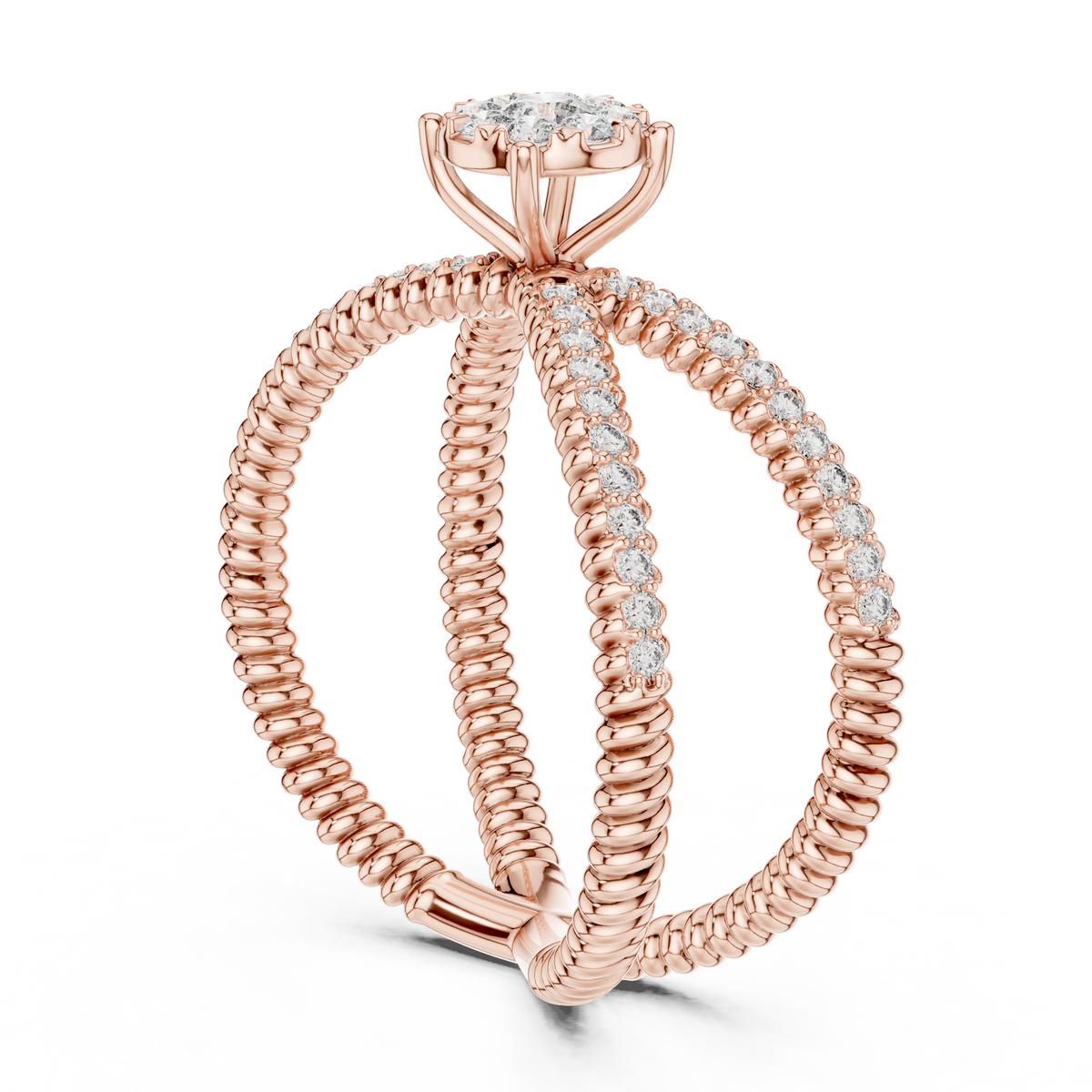 This striking diamond ring features a round cut diamond cluster arranged in a halo-style centerpiece, creating visual depth and amplified brilliance. The design is enhanced by a graceful crossover twist band, accented with shimmering round diamonds that add symmetry, dimension, and a refined sculptural presence.