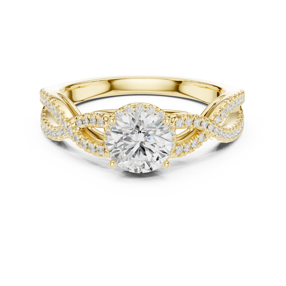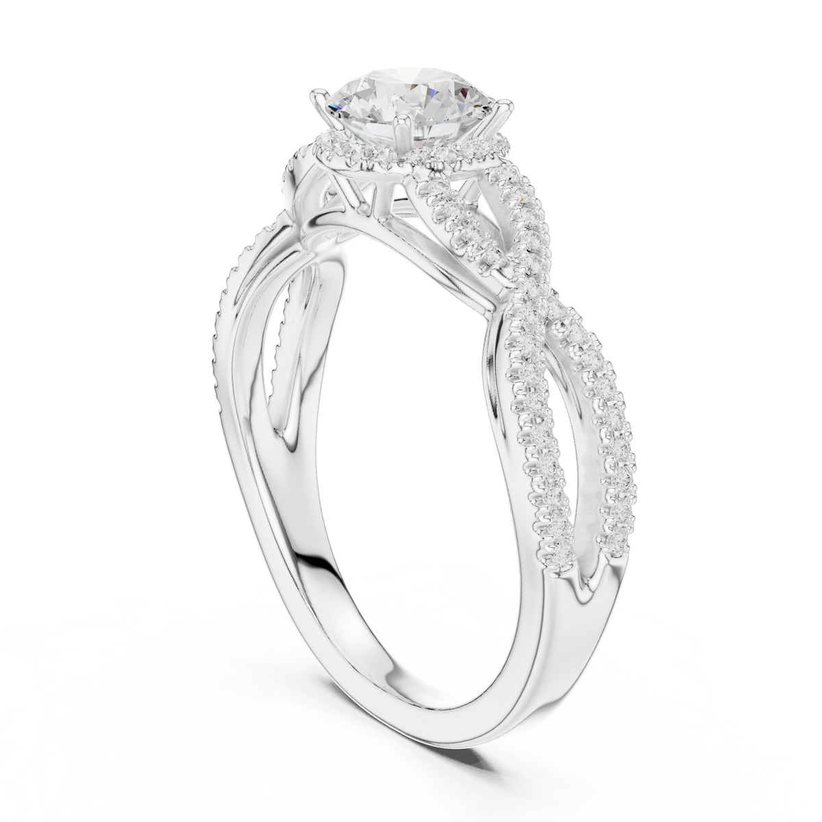 This elegant engagement ring features a brilliant round cut diamond at the center, surrounded by a sparkling halo that enhances size, fire, and brilliance. The graceful twist split-shank band is adorned with pavé-set diamonds, creating beautiful symmetry and depth from every angle. The refined structure allows maximum light reflection, delivering exceptional radiance while maintaining a delicate and luxurious profile.