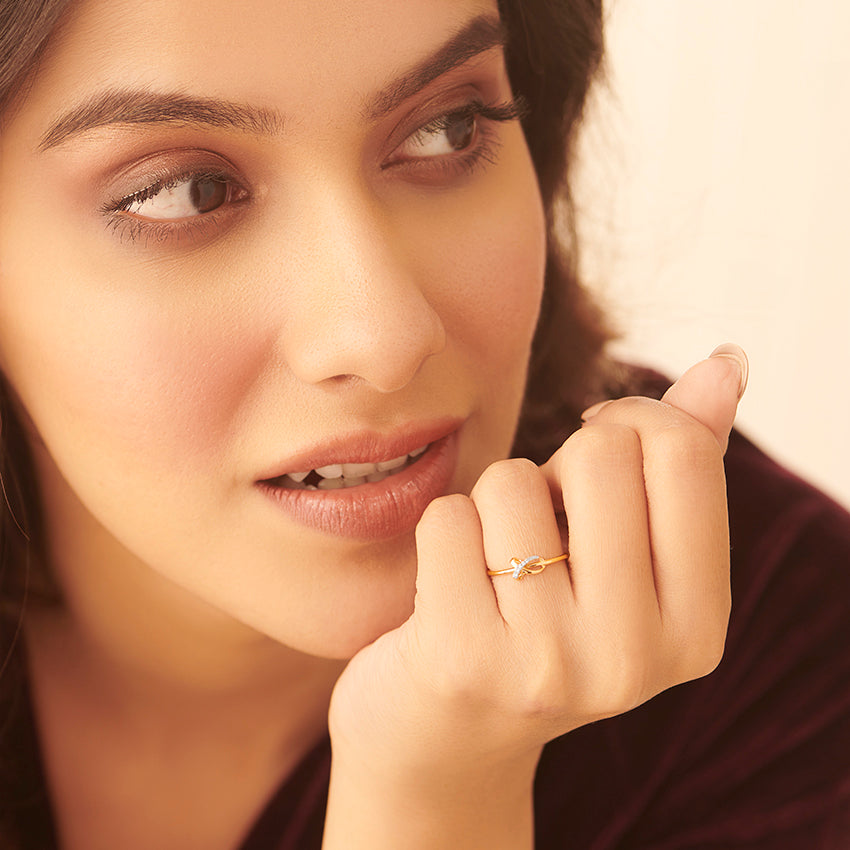 This delicate Classy Knot Diamond Ring features a graceful twist design in yellow gold, partially embellished with diamonds. The flowing lines create a sense of movement, while the contrast between polished metal and sparkling stones adds depth. It's a versatile piece suitable for both casual and formal occasions. This ring appeals to the woman who appreciates subtle yet eye-catching jewellery. Explore this charming diamond ring at CzedJewels.