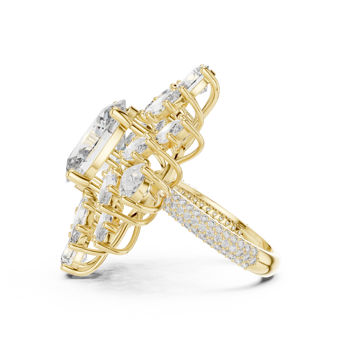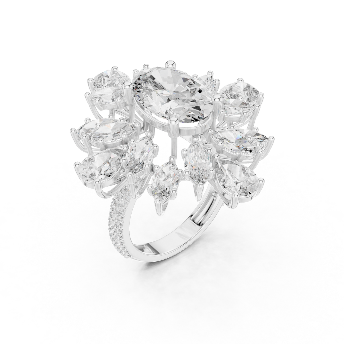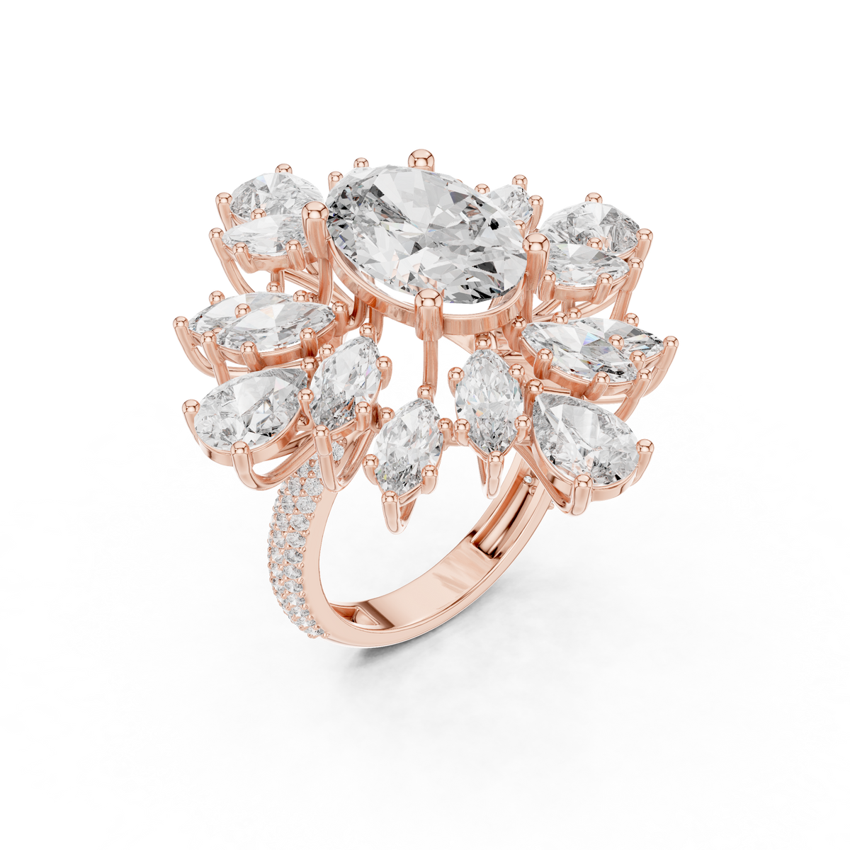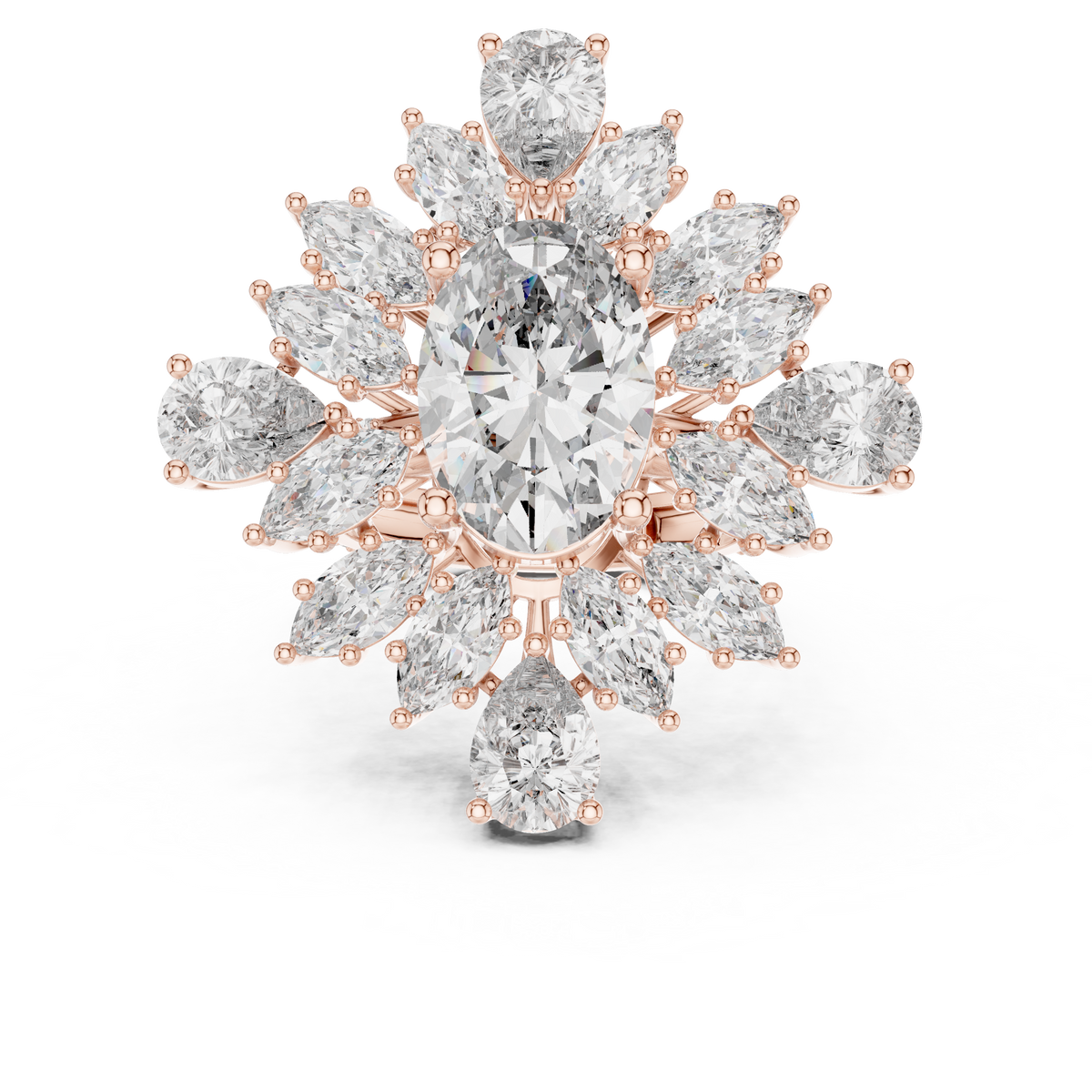 - Side stones: Marquise and pear shaped diamonds arranged in a floral halo, accented with round brilliant diamonds