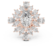 This statement ring features a striking oval cut color stone at its center, surrounded by a radiant floral arrangement of marquise and pear shaped diamonds. The layered composition creates exceptional visual depth, while the symmetrical halo design enhances brilliance from every angle. Carefully structured settings elevate the center stone, delivering a bold yet refined presence.