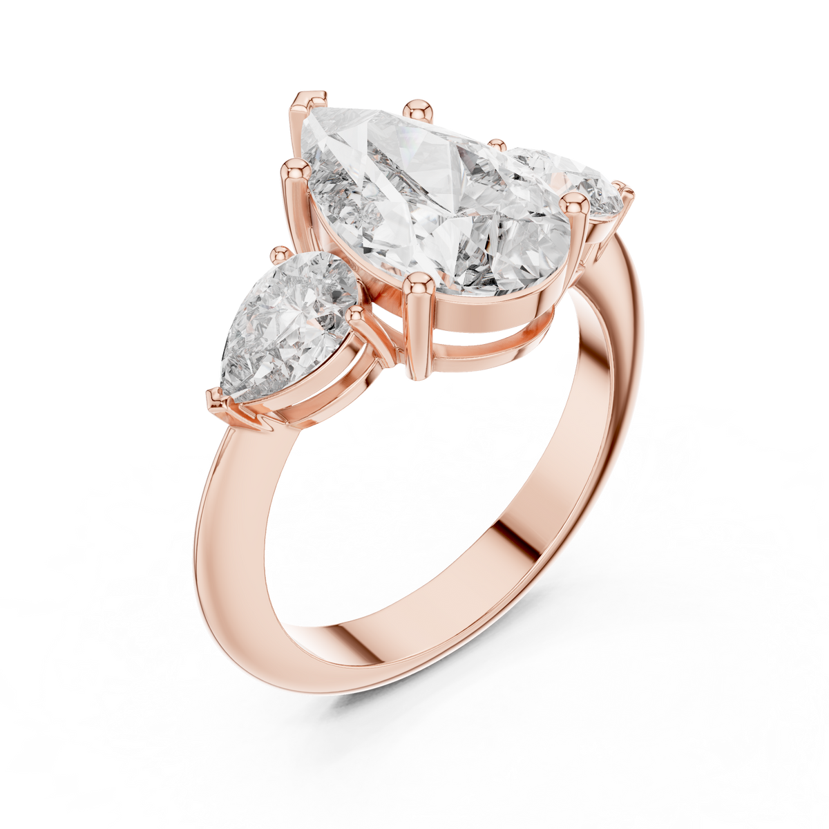 This elegant engagement ring features a captivating pear cut diamond at its center, accented by two matching pear-shaped side stones. The three stone arrangement creates perfect symmetry, enhancing visual depth and delivering exceptional brilliance from every angle.