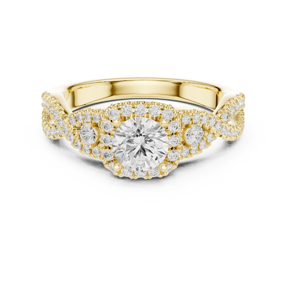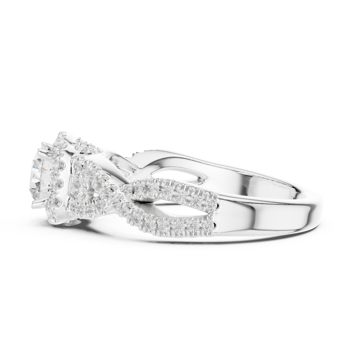 This refined engagement ring showcases a brilliant round cut diamond at the center, encircled by a luminous halo of accent stones that amplify light and dimension. The band flows into an elegant twist split shank, lined with pavé-set diamonds that create graceful symmetry and continuous sparkle. The layered design enhances visual depth while maintaining a delicate, balanced silhouette for timeless sophistication.