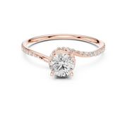 This elegant engagement ring showcases a round brilliant cut diamond at its center, secured in a classic prong setting that maximizes light return and fire. The band gently splits and twists into a refined pavé design, creating soft curves that frame the center stone with balanced symmetry and graceful movement. The combination of a sleek silhouette and shimmering side stones delivers exceptional depth, brilliance, and timeless sophistication.