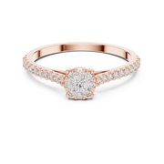This elegant diamond ring showcases a round cut diamond floral cluster at the center, forming a soft halo-inspired silhouette with refined symmetry. Pavé-set round diamonds extend along the band, enhancing visual depth and creating a continuous flow of brilliance. The balanced proportions and open structure allow light to reflect beautifully from every angle.