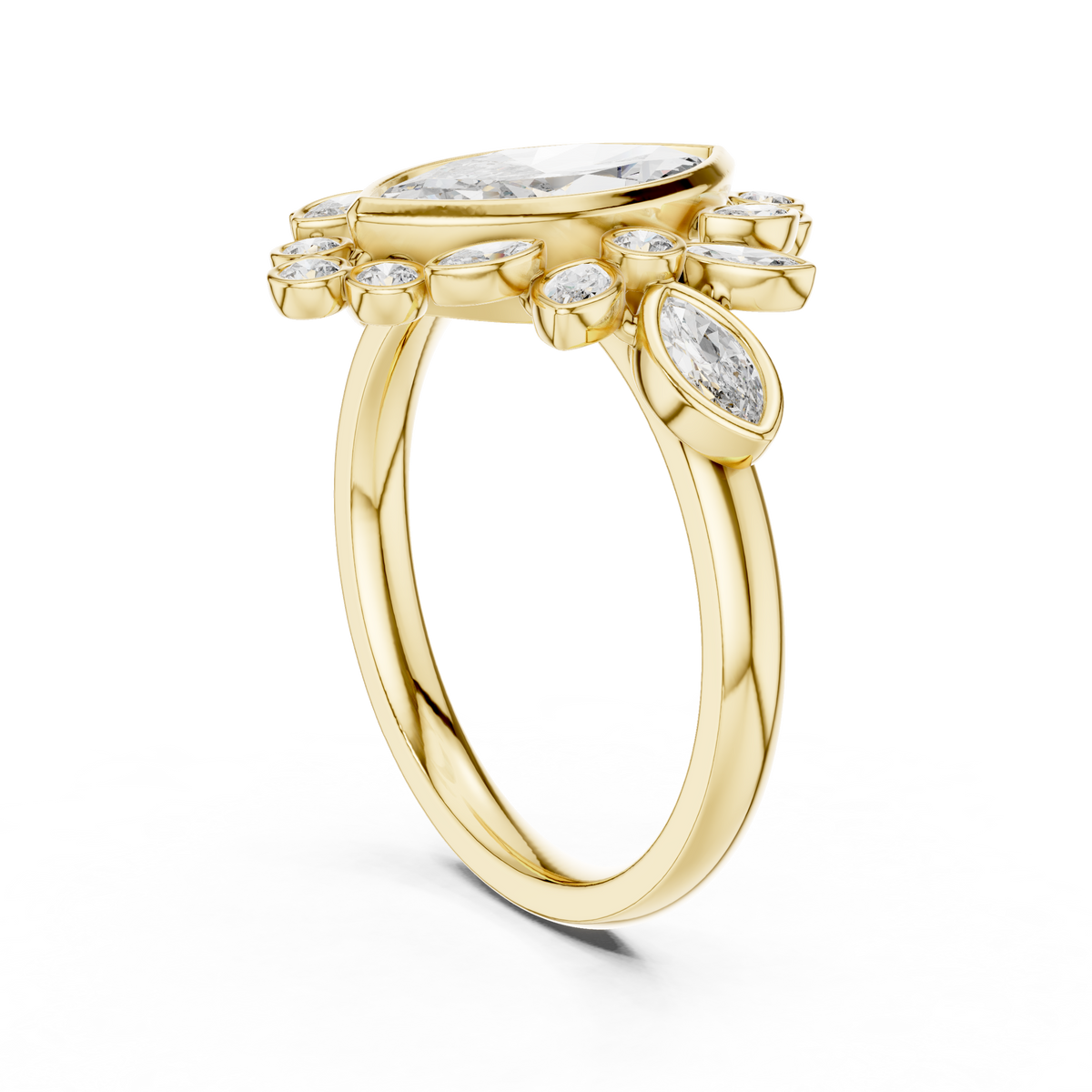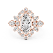 - Side stones: Twelve round cut diamonds forming a radiant halo