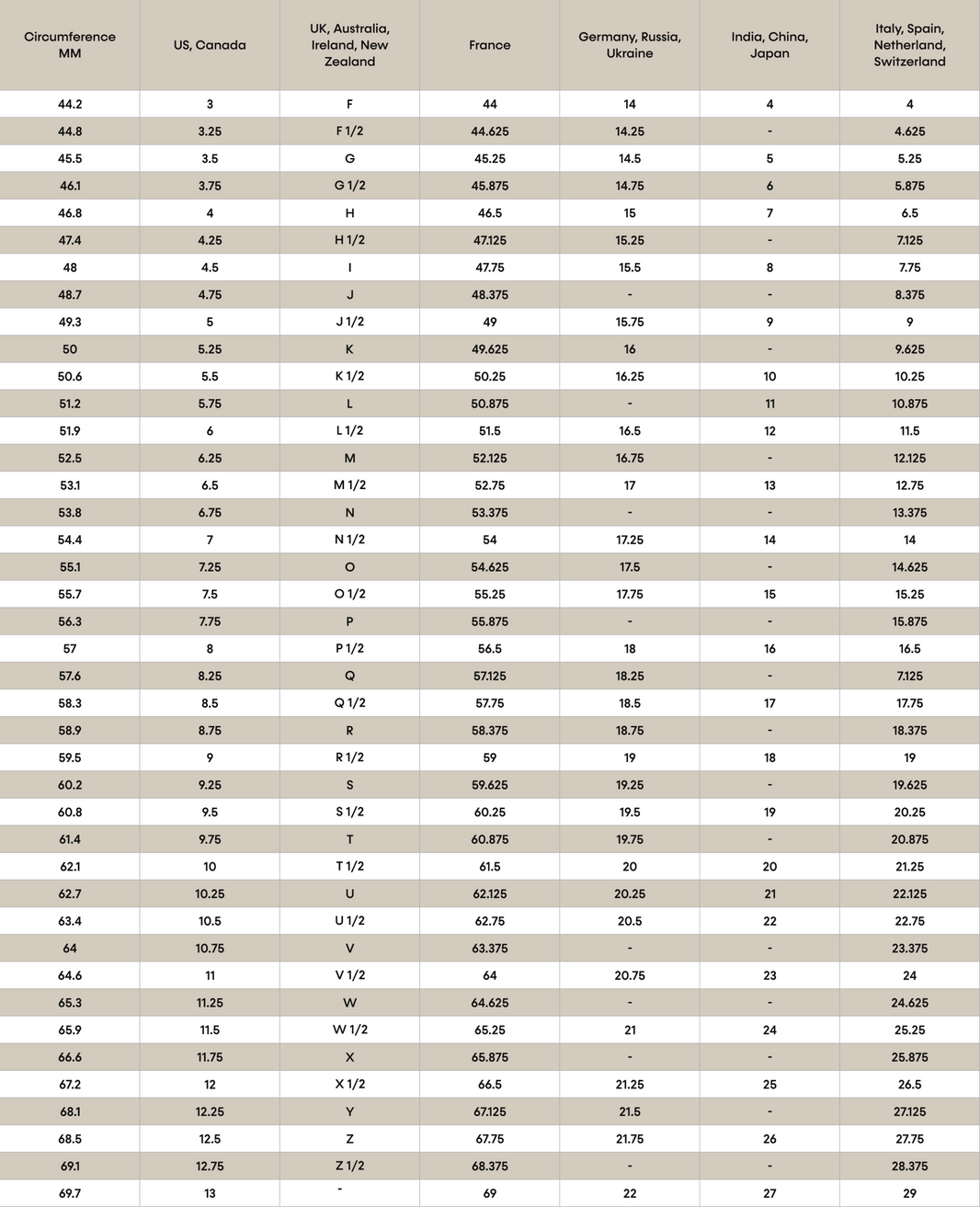 Have your ring size on hand, but your preferred jeweler uses a different sizing scale? Simply download the table provided below to easily convert and find your size in the desired scale. If you're uncertain about your ring size, continue scrolling down the page for a step-by-step guide on measuring your ring size at the comfort of your home.