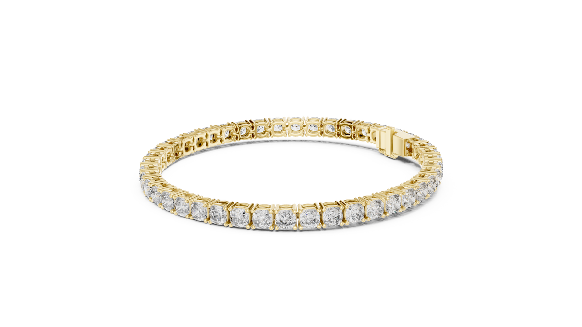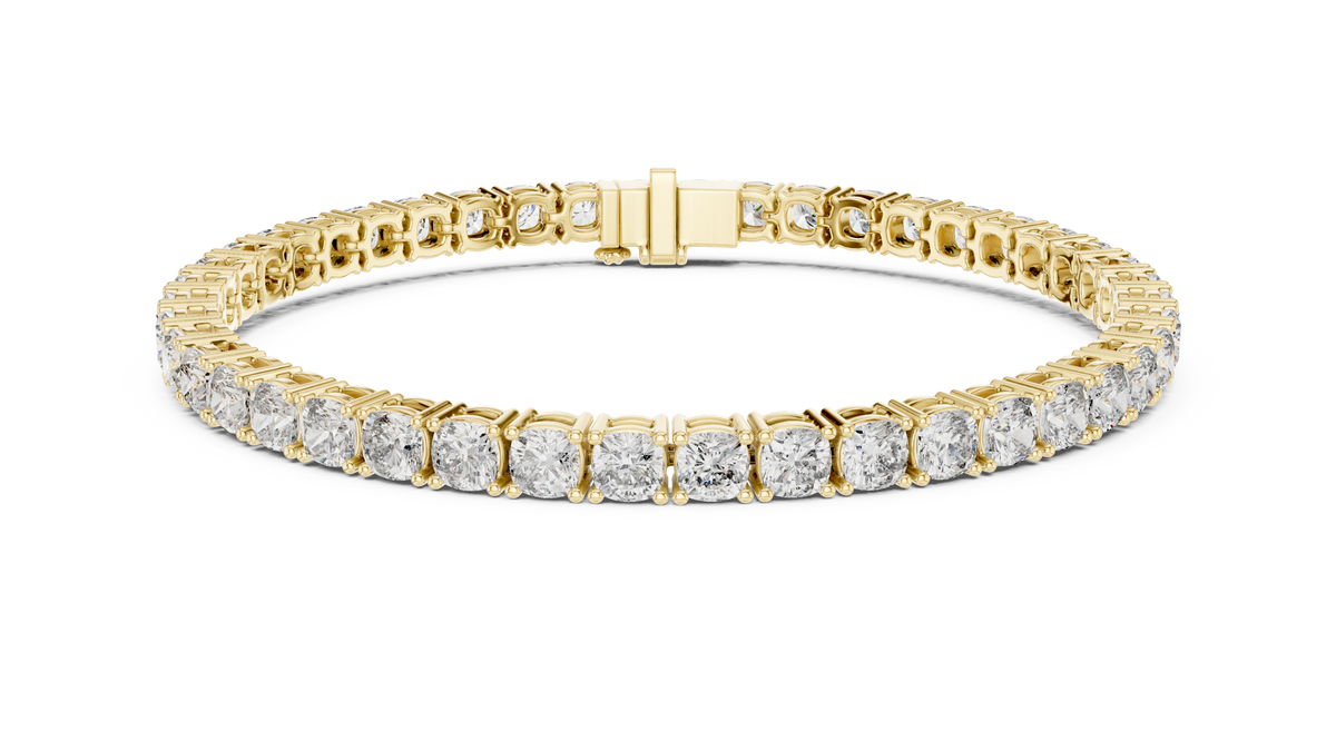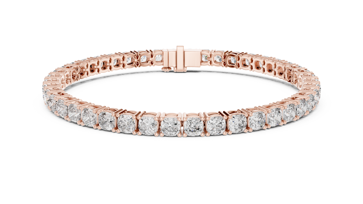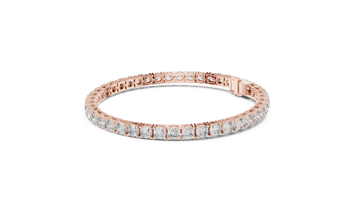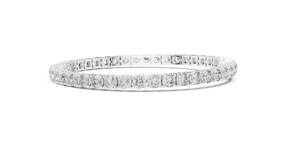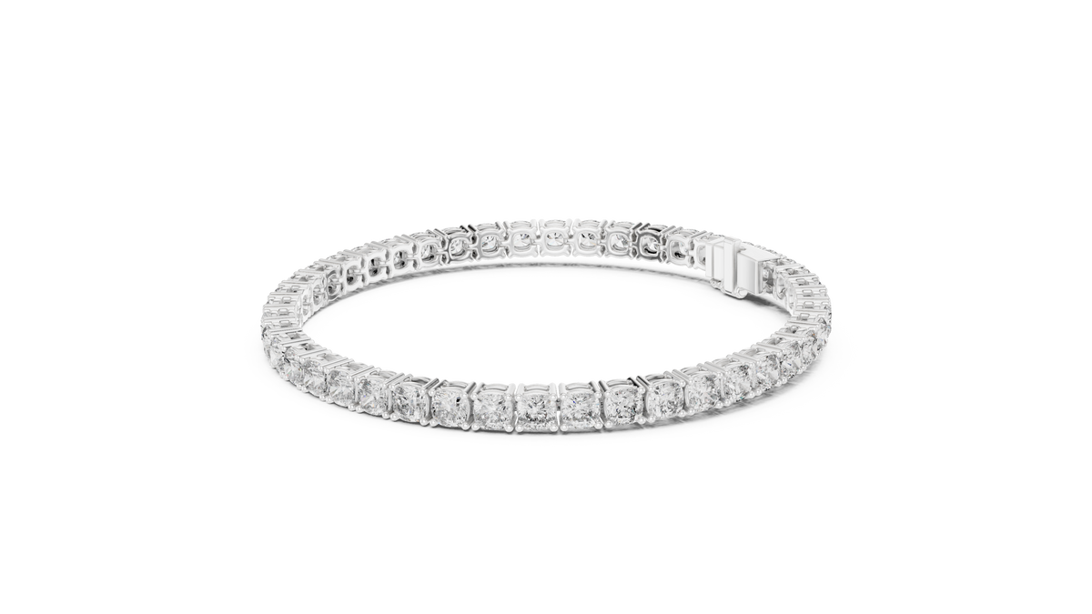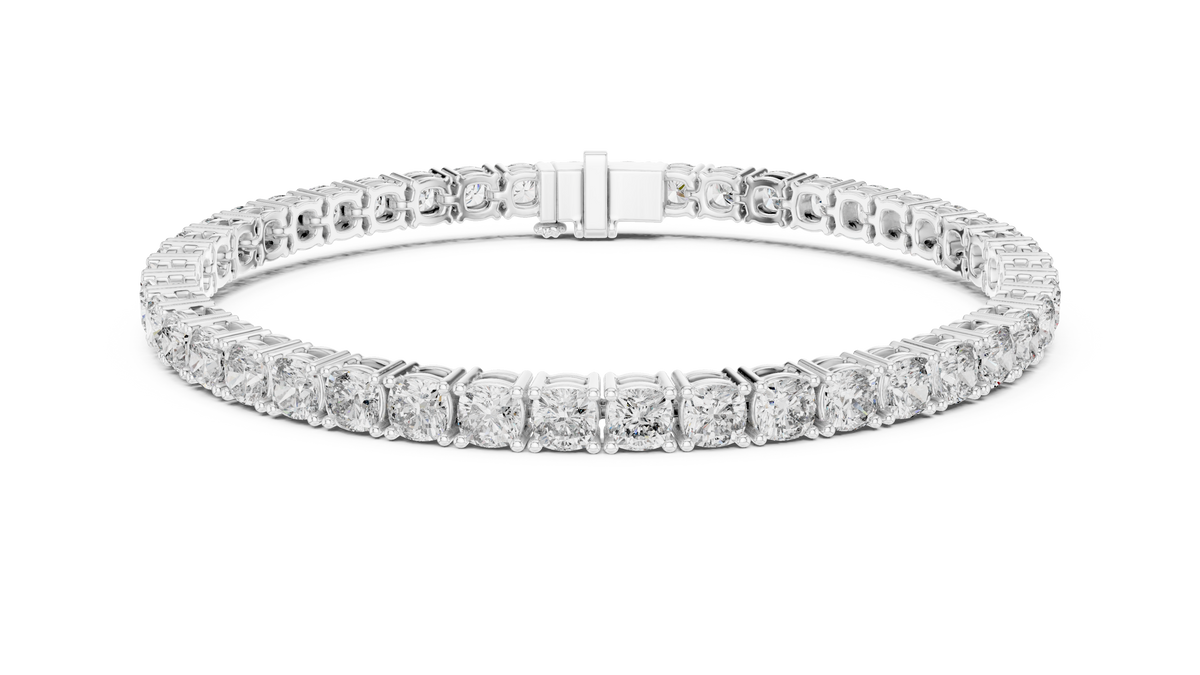 This elegant tennis bracelet showcases a continuous row of cushion cut diamonds, each secured in a refined collet setting that enhances brilliance and symmetry. The seamless linked structure creates a fluid, sophisticated silhouette with exceptional sparkle and depth, making it a timeless luxury statement.