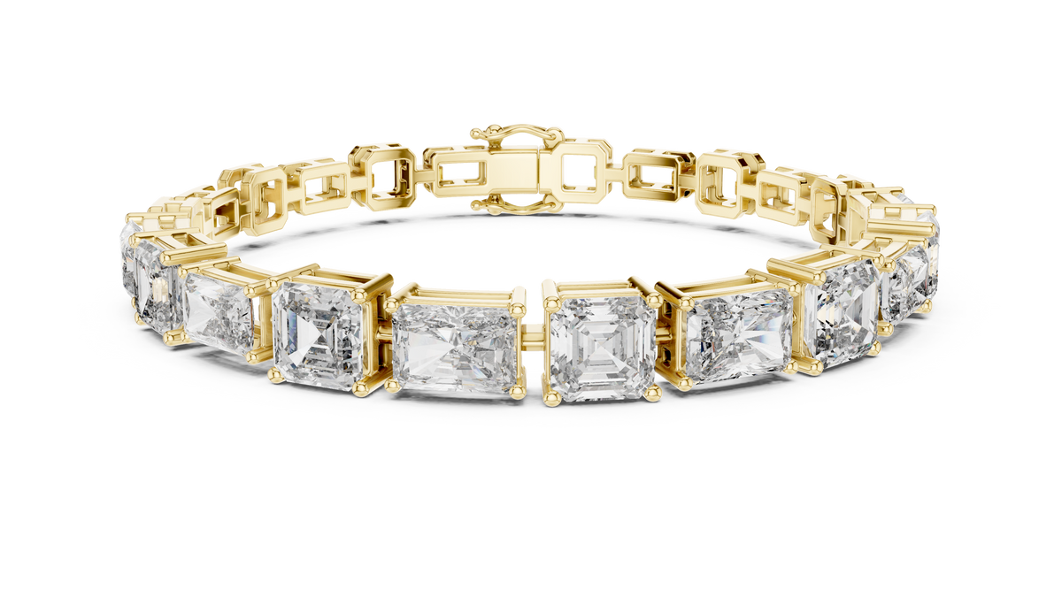 This exquisite tennis bracelet showcases a striking sequence of emerald and radiant cut diamonds arranged in a bold, symmetrical design. Each diamond is meticulously set in a refined prong setting, allowing maximum light reflection and brilliance. The structured yet fluid link construction ensures graceful movement around the wrist, while the clean geometric silhouettes of the mixed cuts create depth, dimension, and unmistakable presence.