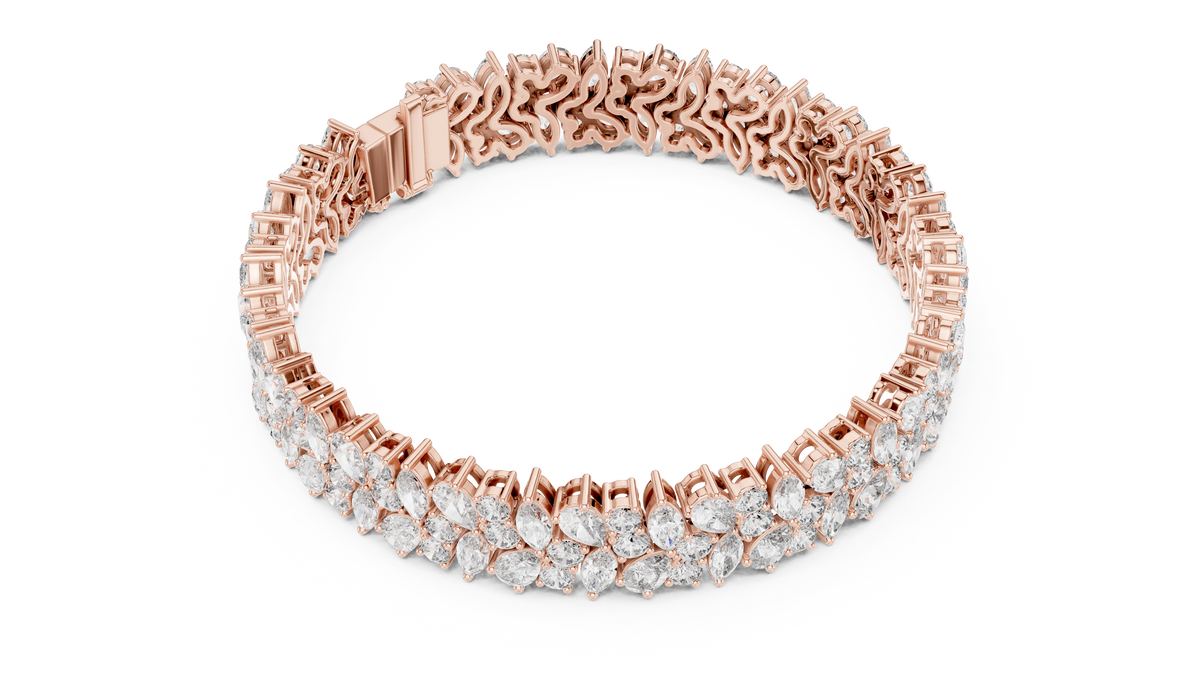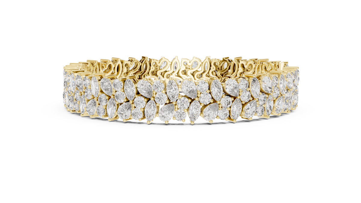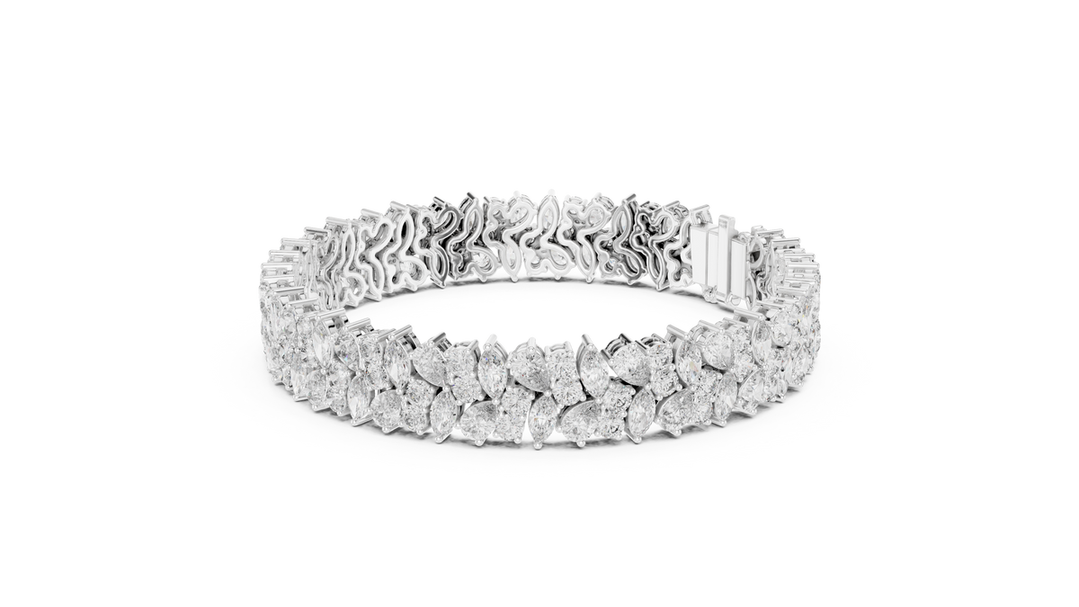 This striking tennis chain bracelet showcases a luxurious cluster design composed of multiple diamond shapes arranged in a continuous, high-impact silhouette. Round, pear, and marquise stones are intricately set in flowing collet settings, forming a layered pattern that creates depth, texture, and brilliant light play. The wide profile and articulated chain structure ensure both flexibility and comfort while delivering bold presence and exceptional sparkle. Designed to make a statement, this bracelet blends modern glamour with timeless elegance.