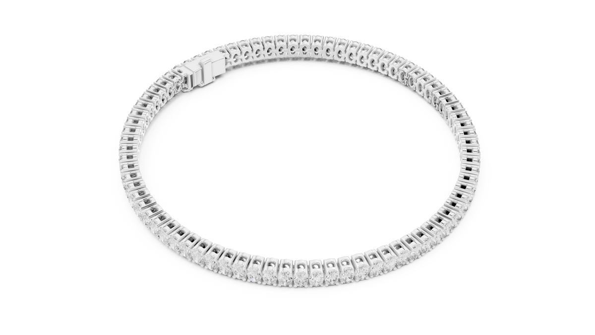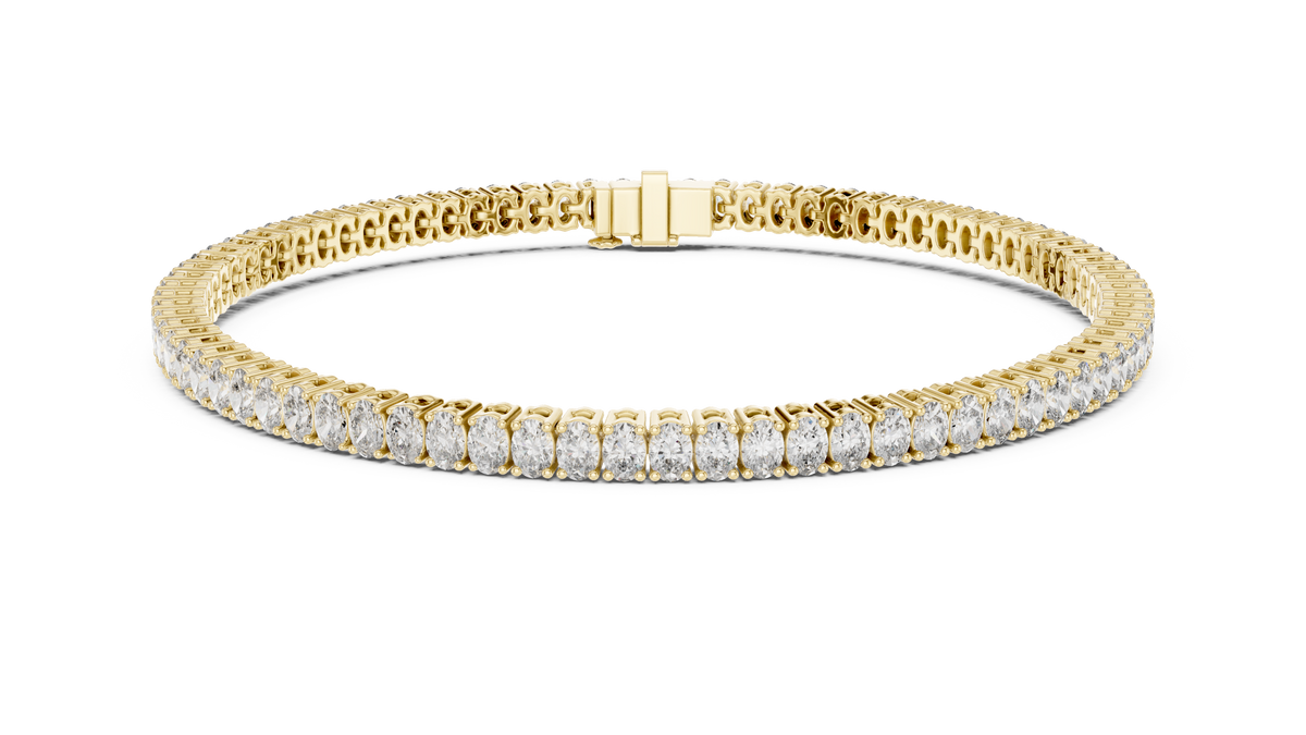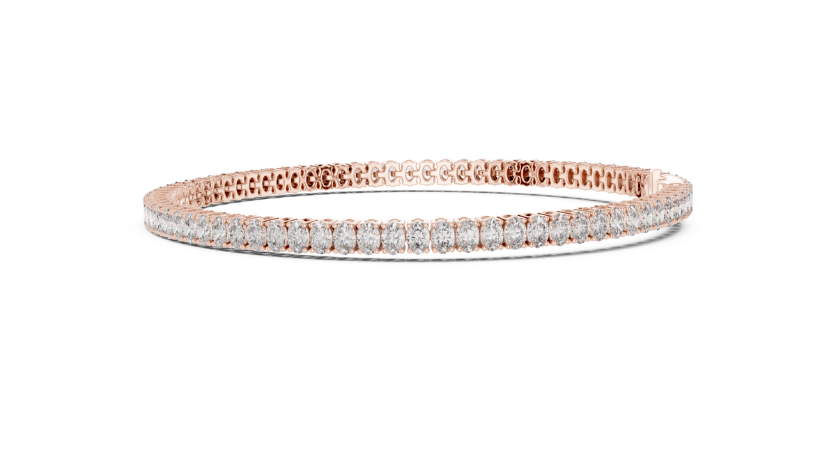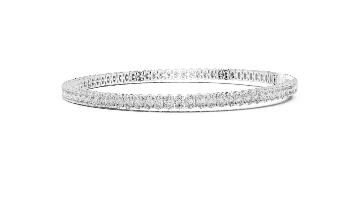 This elegant tennis bracelet features a seamless row of oval cut diamonds arranged in perfect symmetry, creating a fluid line of brilliance around the wrist. Each stone is secured in refined collet-style settings that enhance light exposure while maintaining a clean, modern silhouette. The flexible link construction ensures smooth movement and exceptional comfort, delivering a timeless design with graceful sparkle and polished sophistication.