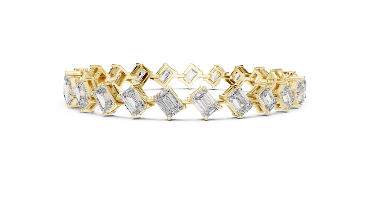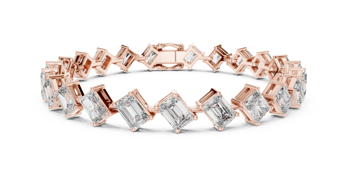 This striking tennis bracelet showcases a bold geometric rhythm of alternating radiant and emerald cut diamonds, creating a captivating interplay of light and structure. Each diamond is individually secured in a refined collet setting, forming a continuous line of brilliance across the wrist. The angular orientation of the stones enhances visual depth while maintaining fluid flexibility, resulting in a balanced silhouette that feels both architectural and elegant.