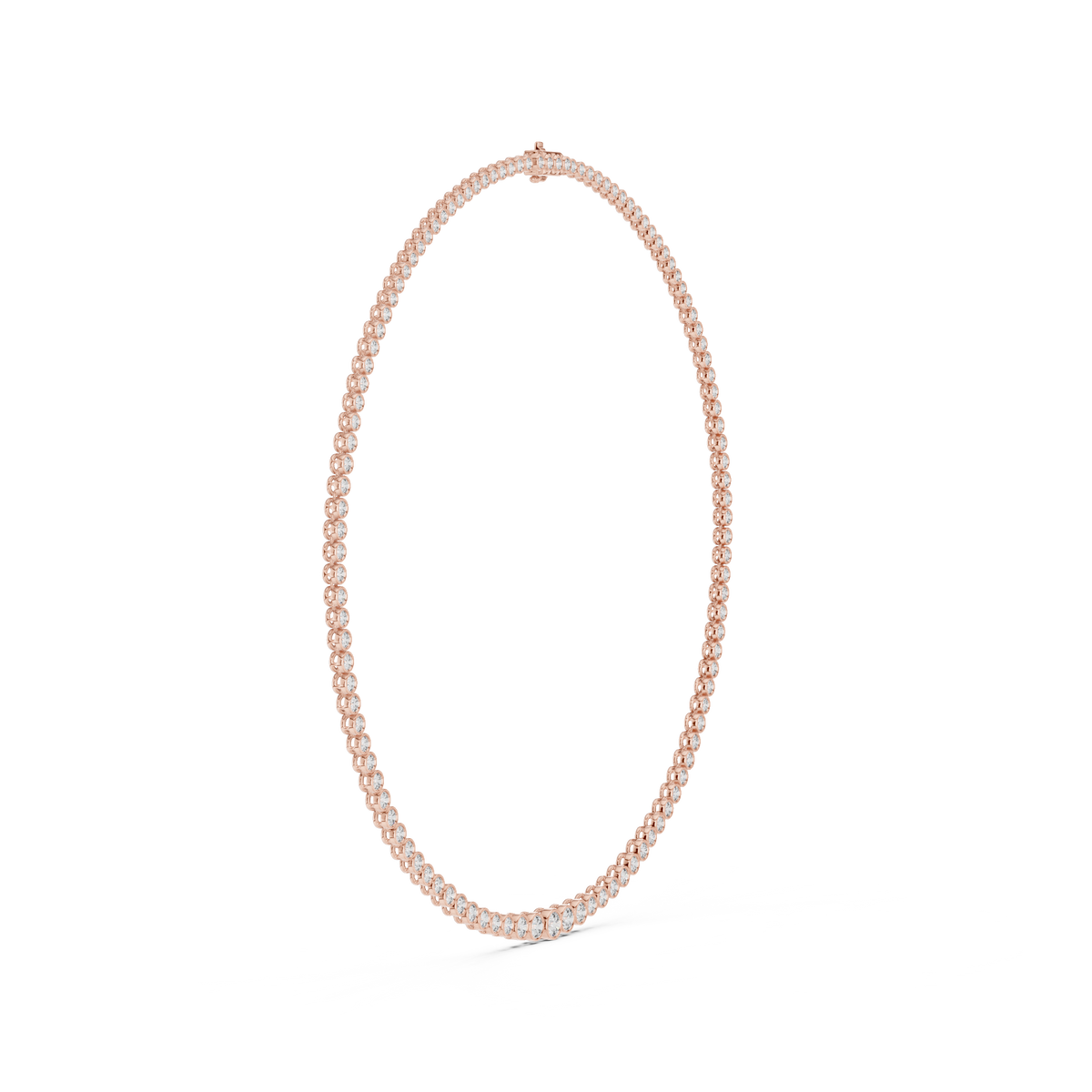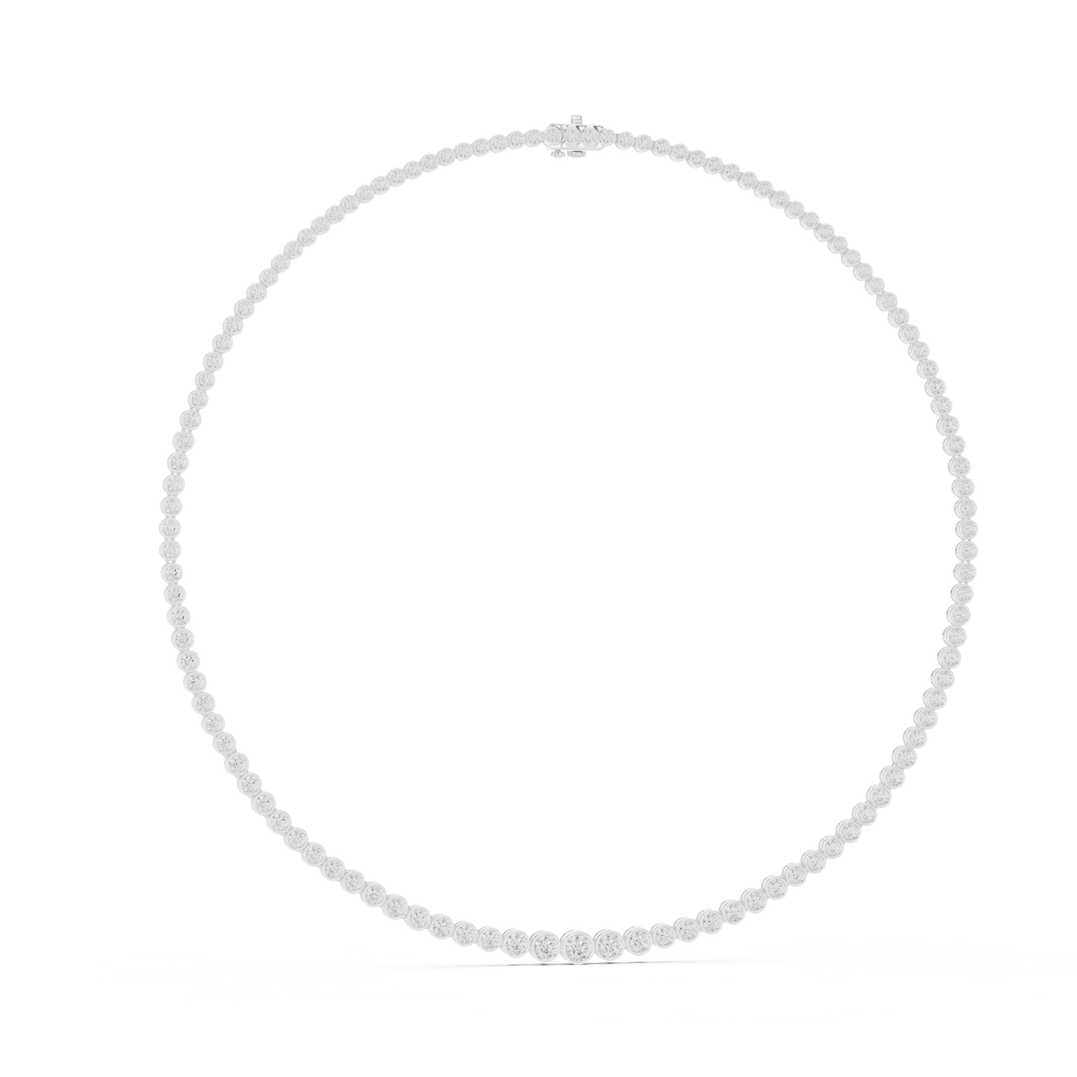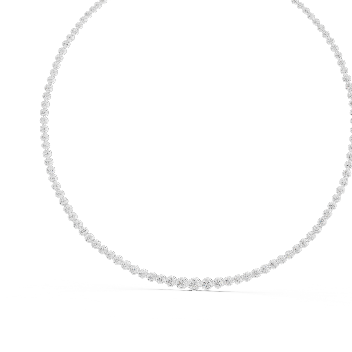 This sophisticated diamond necklace features a continuous tennis-style chain crafted with evenly spaced round brilliant diamonds, each secured in a sleek bezel setting. The clean circular frames create a smooth, modern profile while allowing the diamonds to shine with uninterrupted brilliance. Designed with perfect symmetry and fluid movement, the necklace drapes naturally along the neckline for a refined and timeless look.