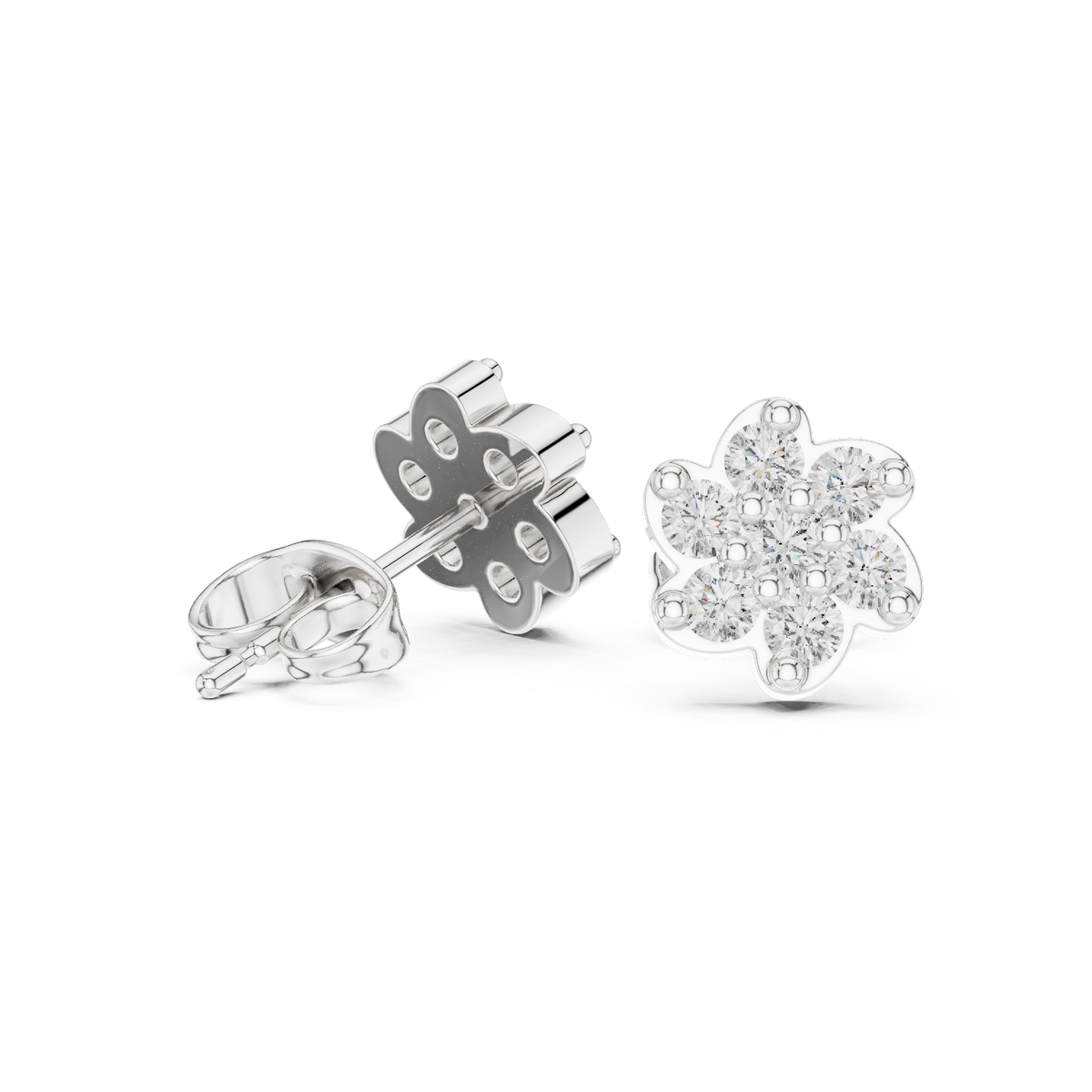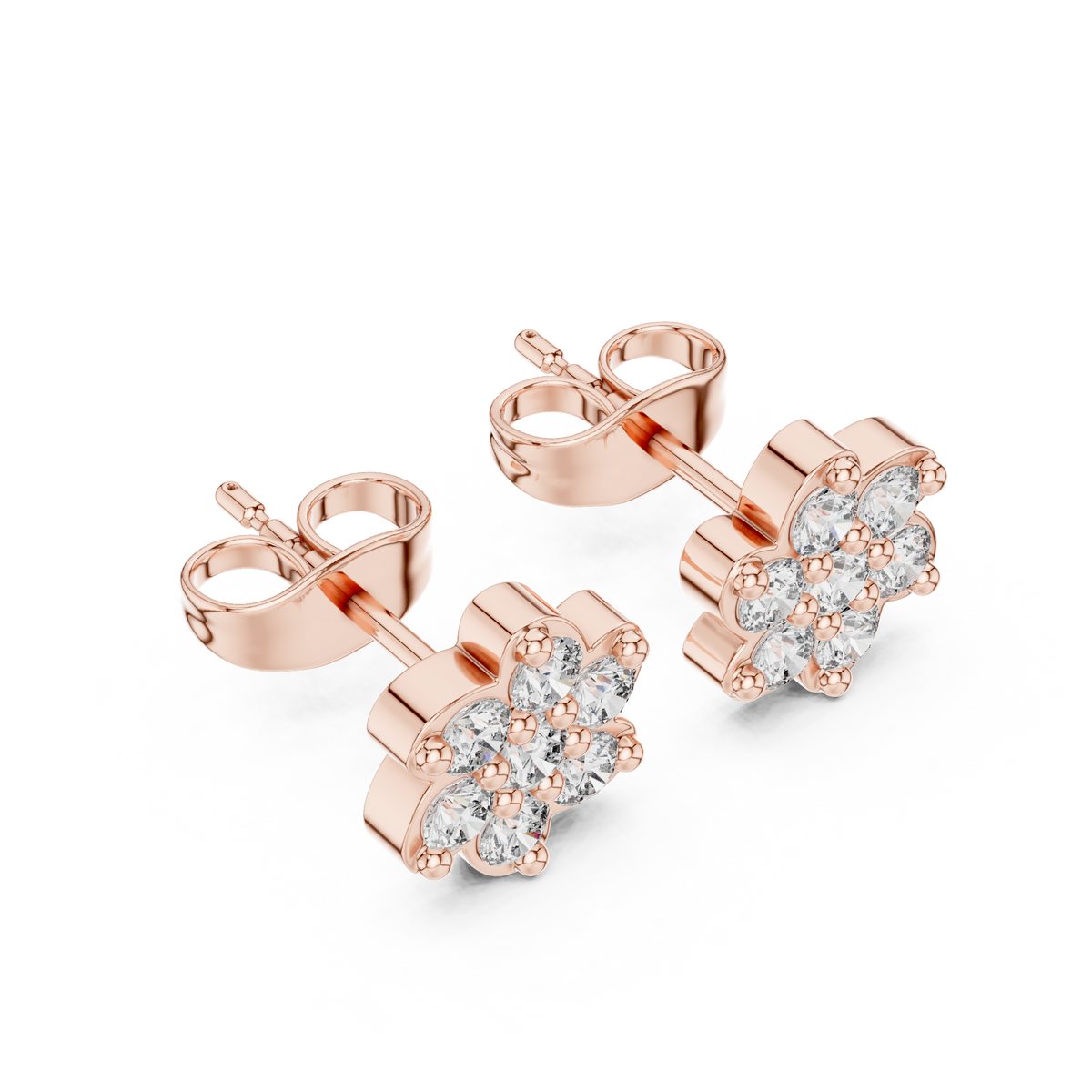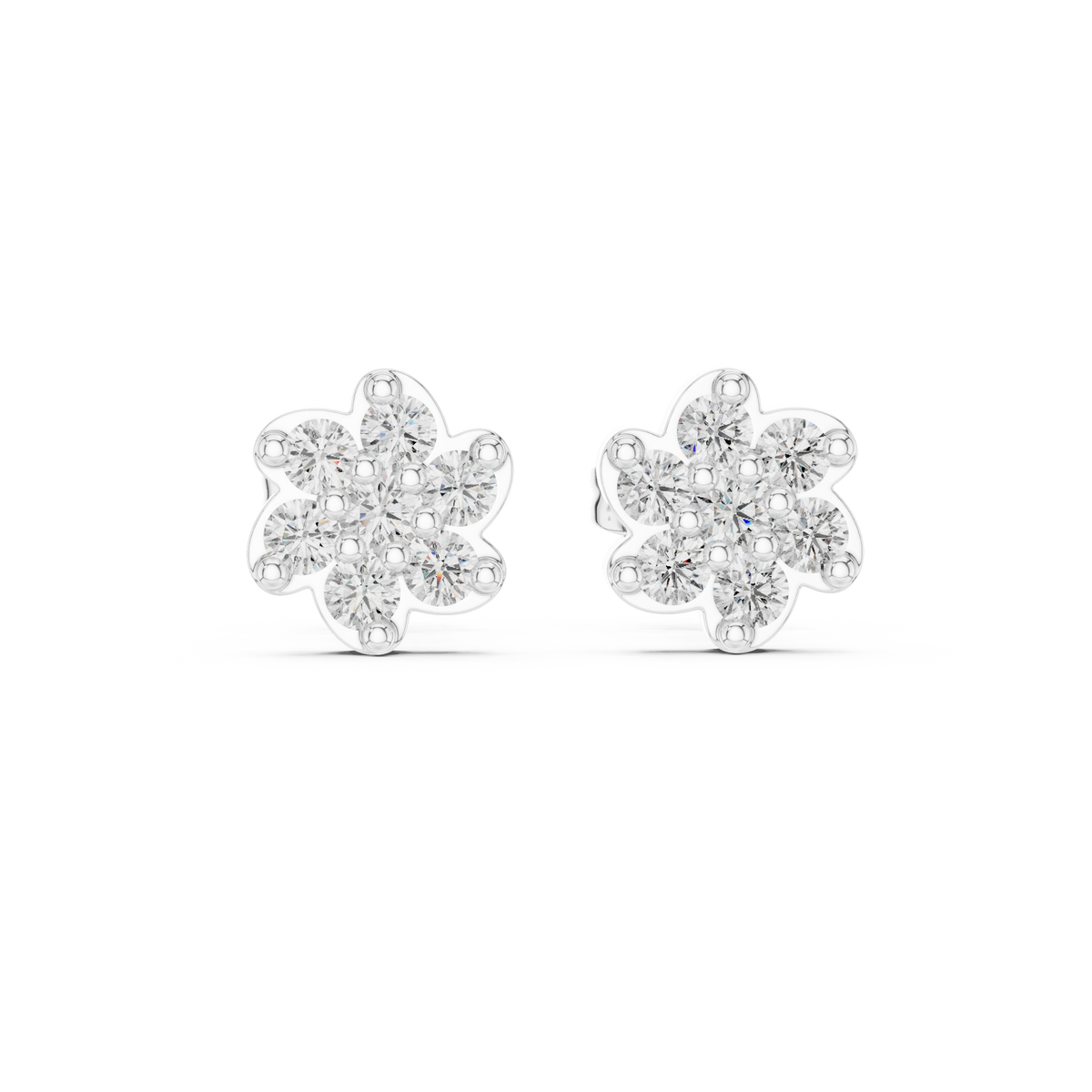 These diamond stud earrings present a charming floral blossom silhouette crafted with round brilliant cut stones arranged in a compact cluster. Soft, rounded petal edges frame the diamonds, creating a delicate flower-inspired shape with balanced symmetry. The open prong setting allows light to pass through each stone, enhancing sparkle and giving the earrings a bright, lively presence. Elegant and timeless, the design offers refined brilliance in a comfortable everyday stud style.