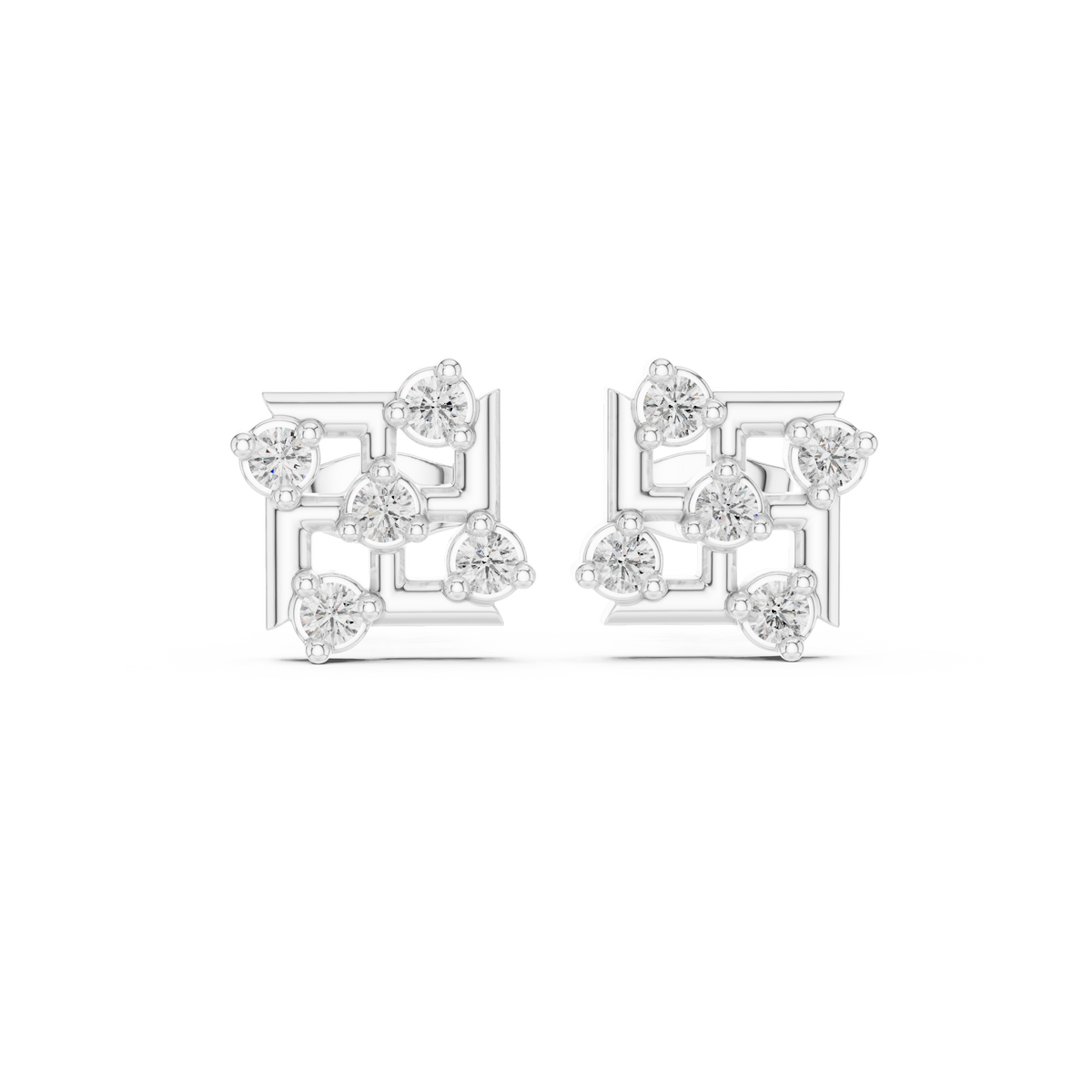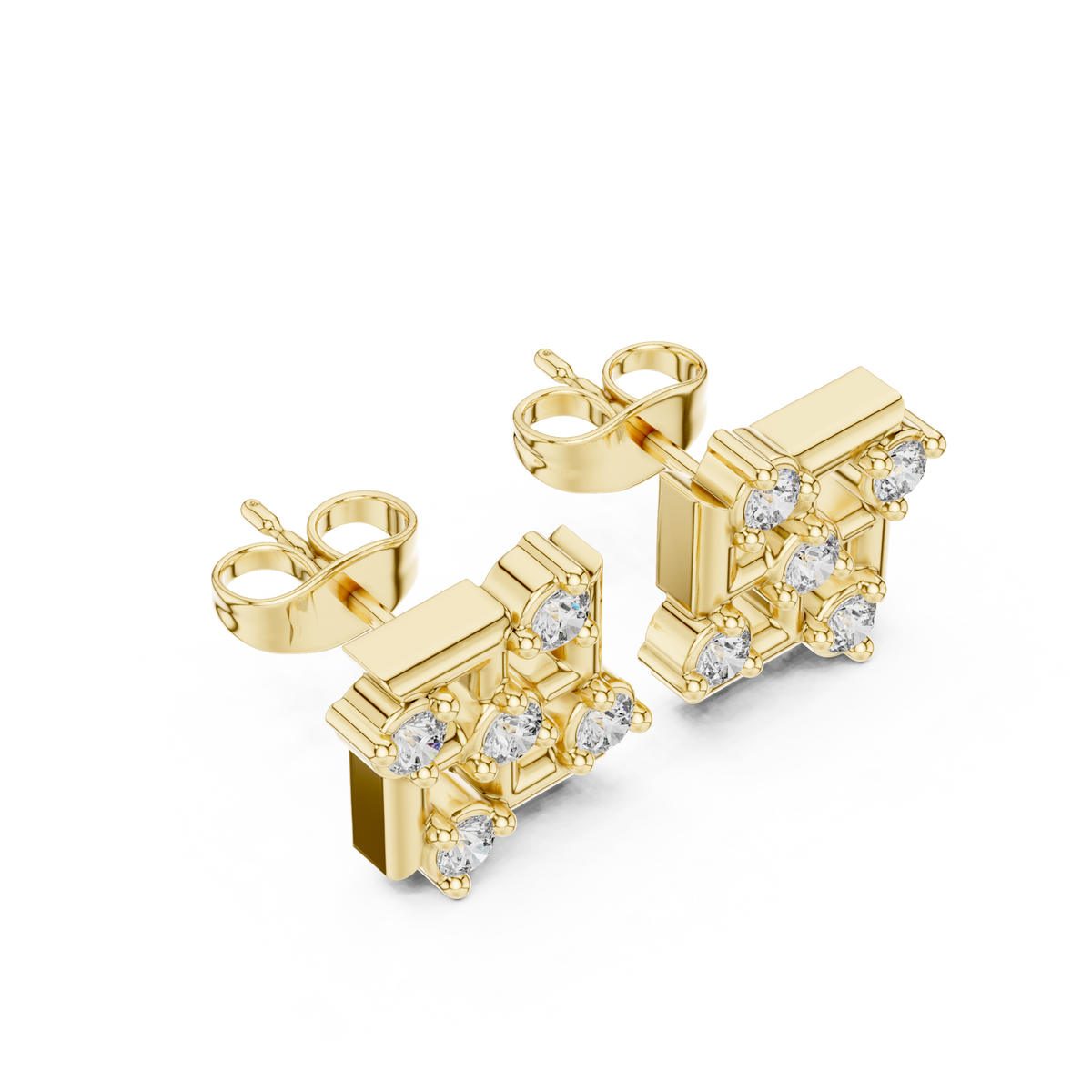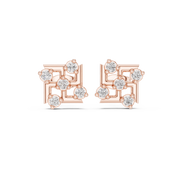 These diamond stud earrings feature a striking geometric square silhouette accented with round brilliant cut stones arranged in a balanced cluster layout. Clean architectural lines frame each diamond, creating a modern yet timeless look with strong visual depth. The structured design enhances light reflection from multiple angles, while smooth collet settings secure every stone with a refined, polished finish. The result is a sophisticated pair of studs that blend contemporary form with classic sparkle.