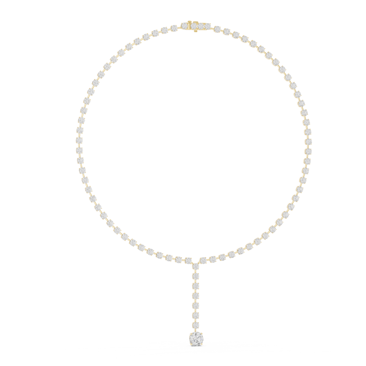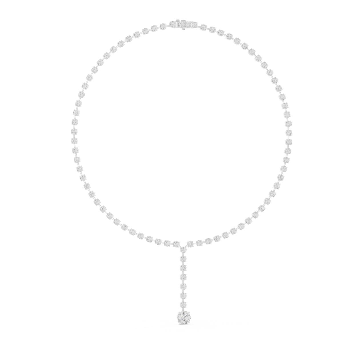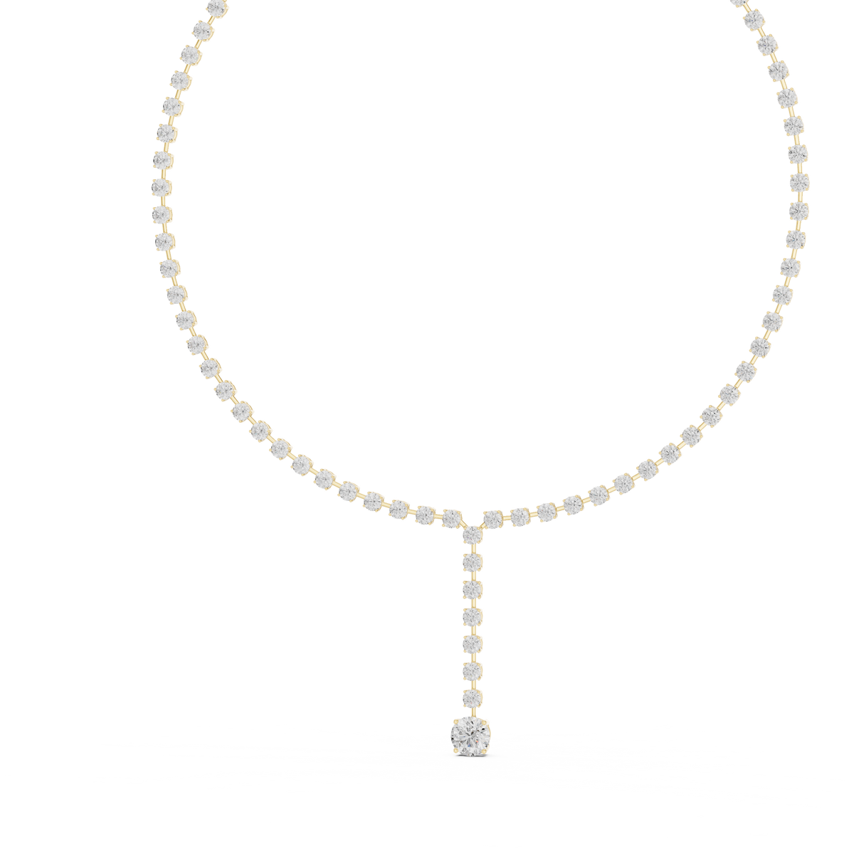 This refined diamond necklace features a classic riviera silhouette accented with an elegant lariat-style drop pendant. A continuous row of round brilliant diamonds forms the neckline, flowing seamlessly into a delicate vertical drop that ends with a larger focal stone. The balanced symmetry, smooth articulation, and polished finish create exceptional light reflection, giving the piece remarkable brilliance, depth, and graceful movement.