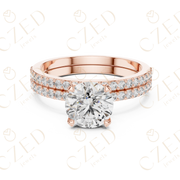 This elegant diamond ring features a striking round brilliant cut center diamond set in a classic prong setting. The design is enhanced by a double row of pave-set round diamonds along the band, creating refined symmetry, visual depth, and continuous sparkle. Its balanced proportions and radiant brilliance deliver a timeless and sophisticated silhouette.