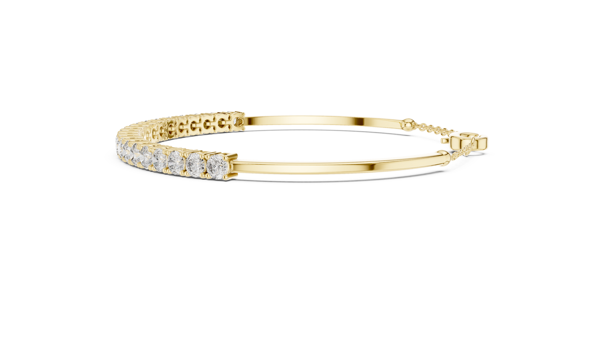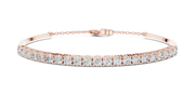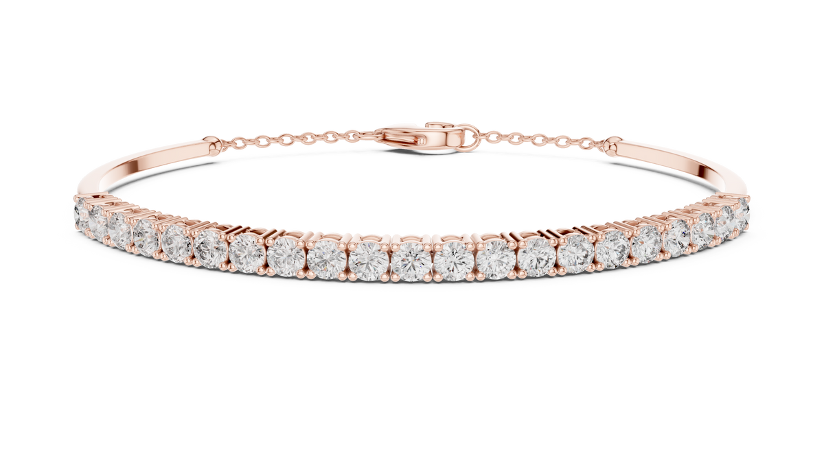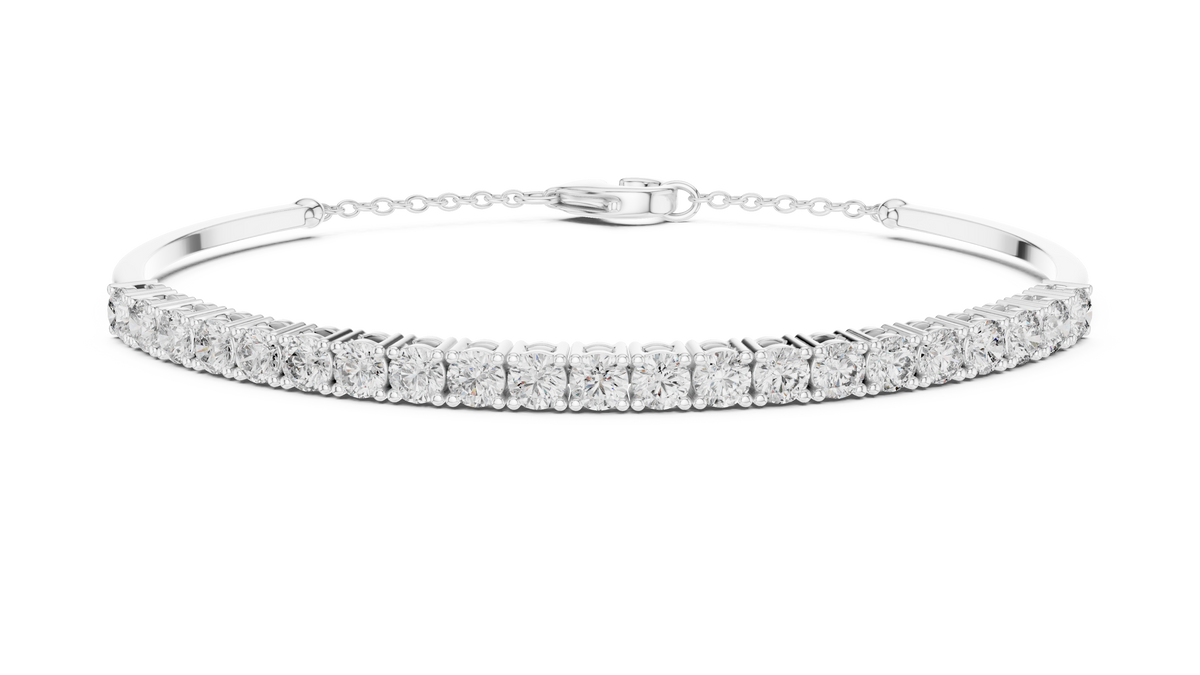 This refined tennis bracelet showcases a continuous row of round cut diamonds set in an elegant collet setting, creating a seamless line of brilliance. The structured design offers symmetry and fluidity, while the extension chain ensures adjustable and secure wear. The polished finish enhances the bracelet’s visual depth and luxurious sparkle.
