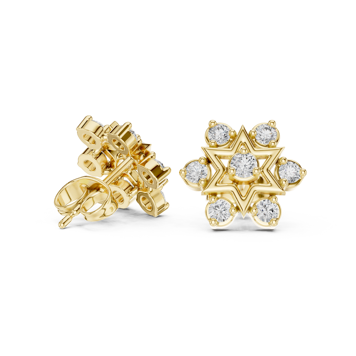 These striking stud earrings feature a bold open starburst silhouette accented with round brilliant diamonds. A central diamond anchors the design, while additional stones radiate around a sculpted geometric star frame. The openwork structure enhances depth and allows light to pass through freely, creating crisp brilliance and a refined yet contemporary presence on the ear.