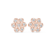 These elegant stud earrings present a graceful openwork floral cluster composed of round brilliant diamonds. A central stone is surrounded by evenly spaced diamonds, linked by flowing metal curves that create an airy, petal-like silhouette. The symmetrical layout and polished contours enhance light reflection, delivering noticeable depth, dimension, and radiant sparkle while maintaining a refined, wearable profile.