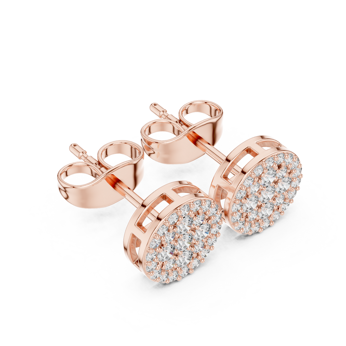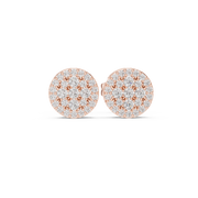 These stud earrings feature a circular disc silhouette fully covered with round cut diamonds arranged in a pavé layout. The symmetrical design creates a uniform, high-impact surface of brilliance with a polished and contemporary finish. The compact stud structure delivers a sleek, balanced look with consistent sparkle across the entire face.