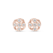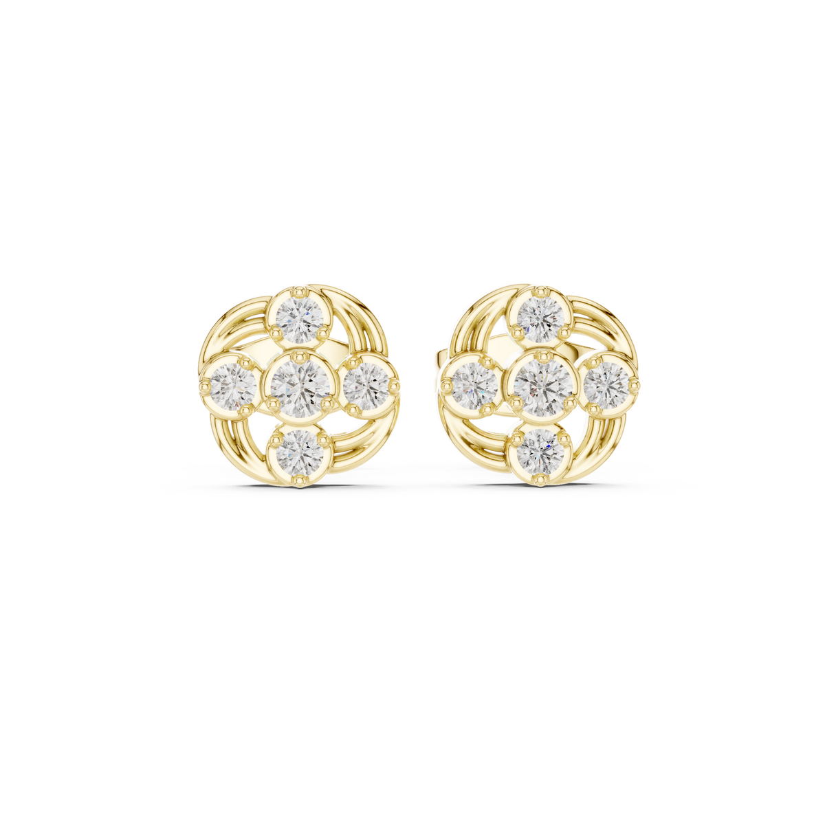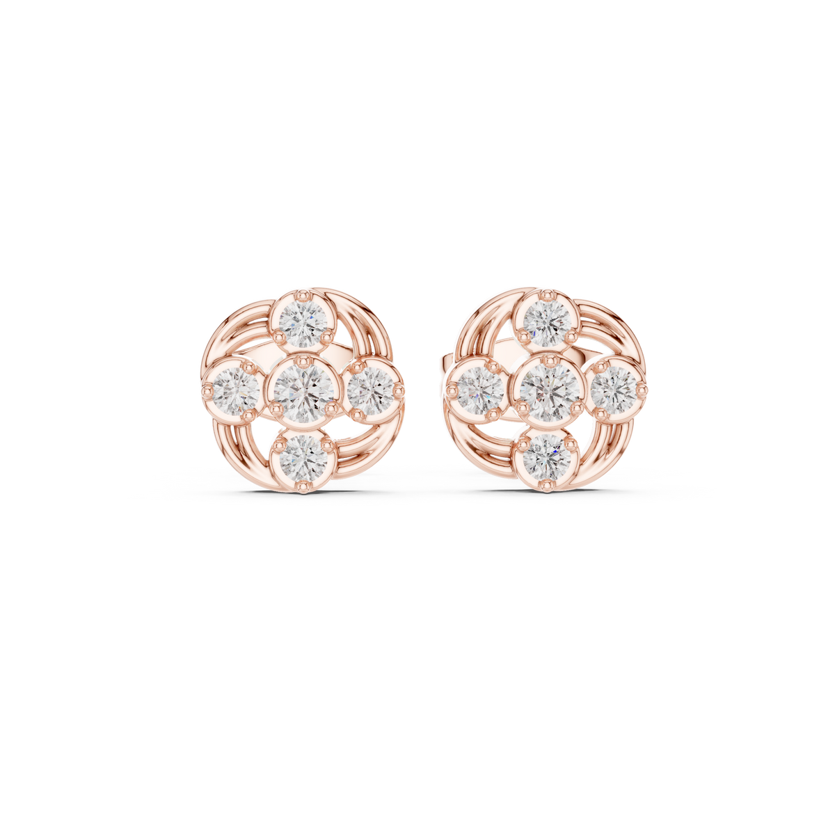 These elegant stud earrings present a petite swirled cluster silhouette crafted with flowing curves and brilliant round diamonds. A central diamond is framed by surrounding stones in a balanced circular formation, creating gentle movement and visual depth. The open, airy structure enhances light reflection, giving the earrings a refined sparkle while maintaining a compact, comfortable profile.