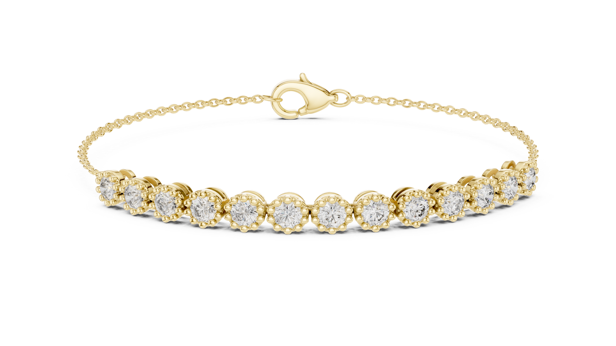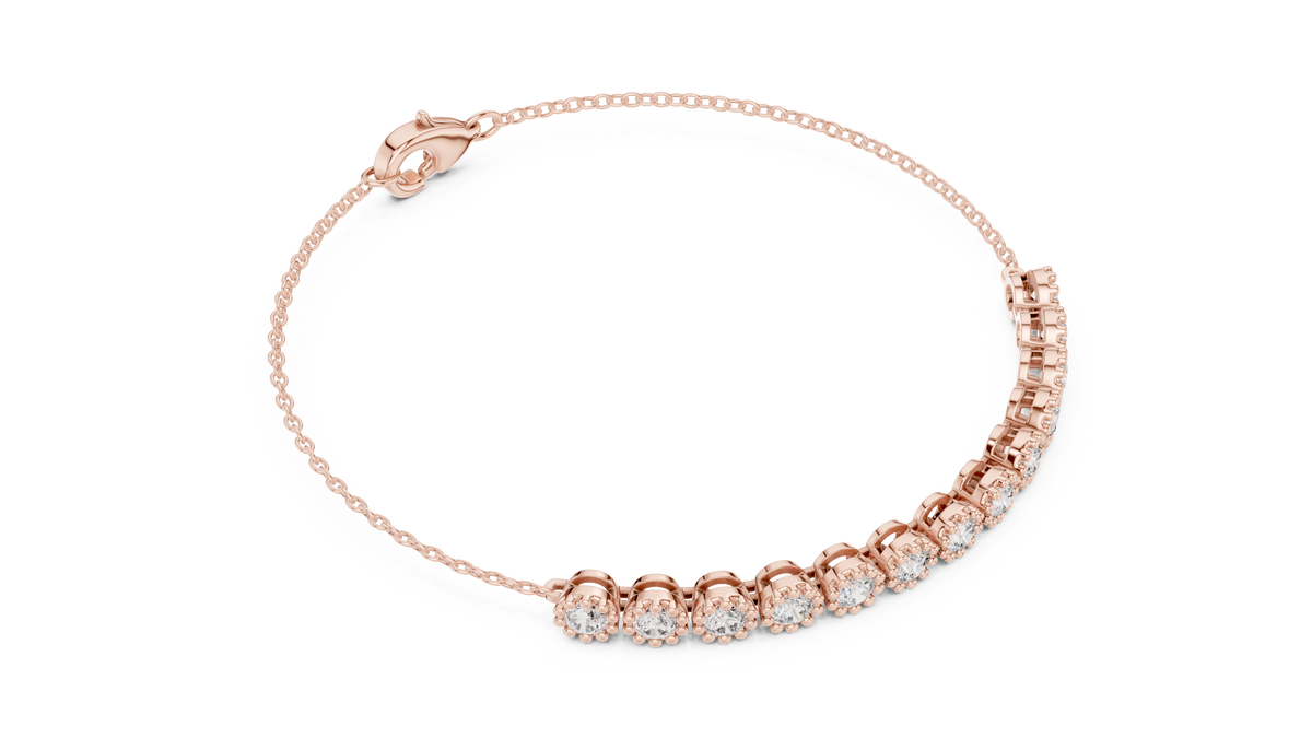 This elegant tennis chain bracelet features a refined row of round cut diamonds arranged in a symmetrical, fluid design. Each diamond is framed in a delicate collet setting, creating a scalloped visual rhythm that enhances brilliance and depth. The slim chain structure adds flexibility and comfort, making it ideal for effortless daily wear or refined evening styling.