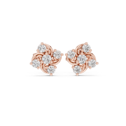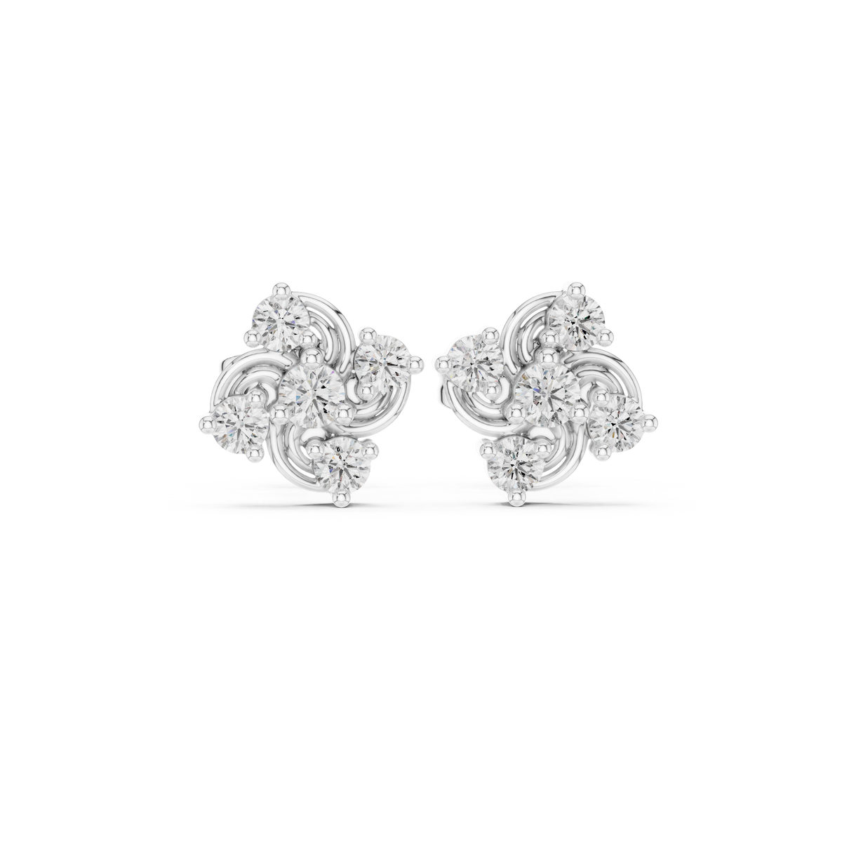 These elegant stud earrings feature a graceful swirl-inspired floral cluster design, where round brilliant diamonds are arranged in a dynamic circular pattern. The flowing metal curves create a sense of movement and depth, while each stone is carefully secured to maximize light reflection. The compact stud silhouette offers a balanced, symmetrical look with refined brilliance and a smooth, polished finish.
