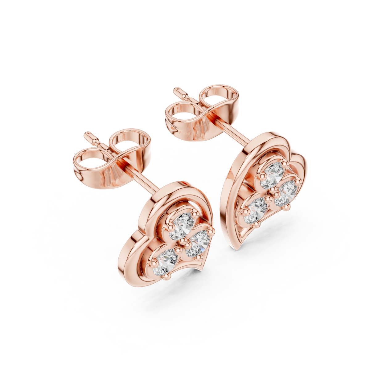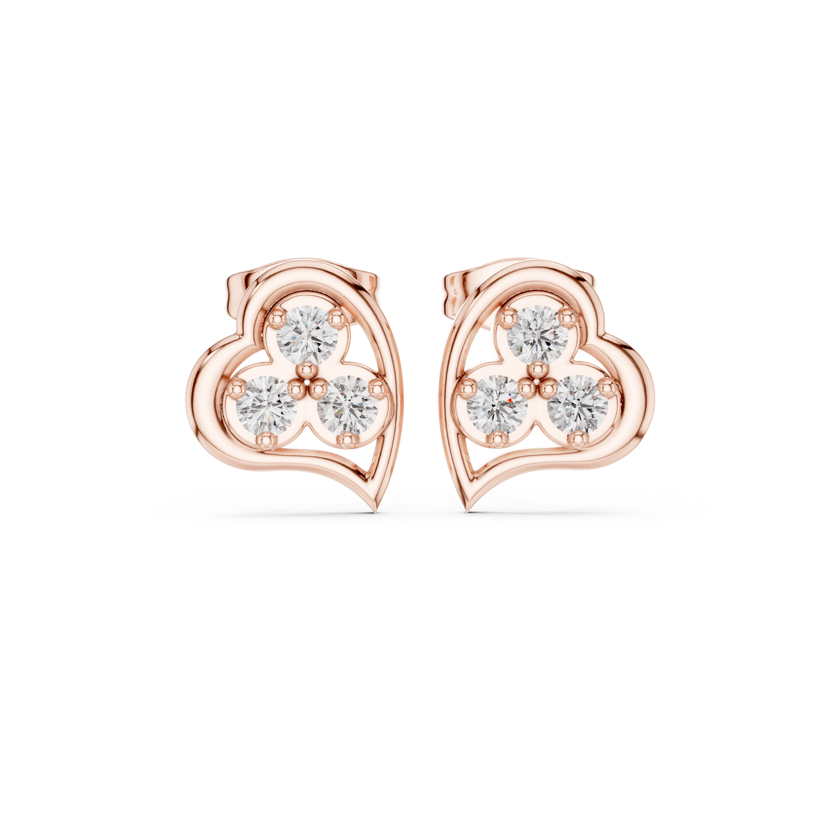 These elegant stud earrings showcase a refined heart-inspired silhouette, delicately formed around a trio of round brilliant cut diamonds. Each stud features a balanced three-stone cluster that creates soft curves and graceful symmetry, offering dimensional sparkle and a polished finish. Designed with a classic prong setting, the diamonds are elevated to capture maximum light for exceptional brilliance and everyday sophistication.