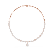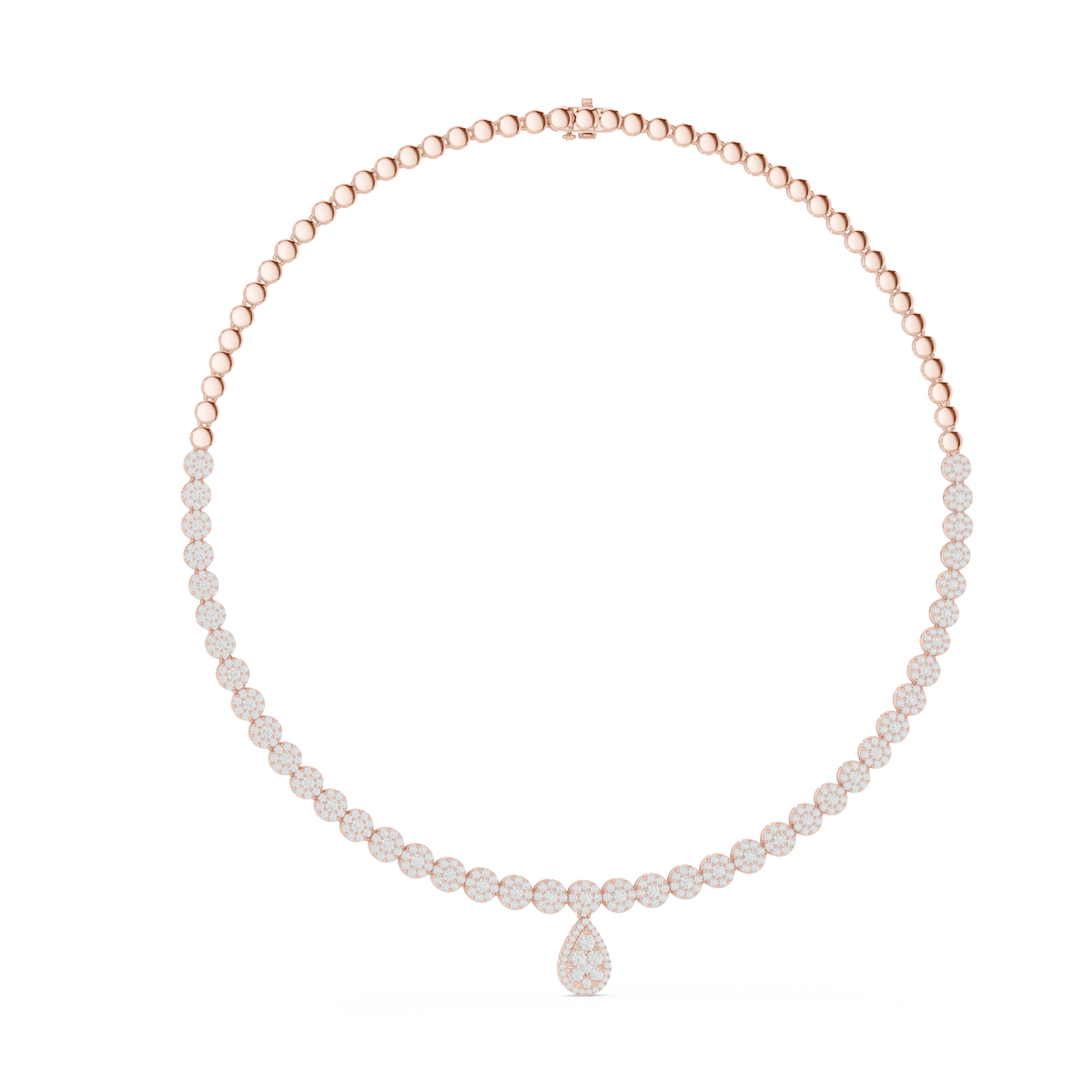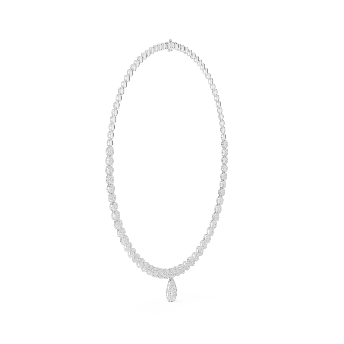 This elegant diamond necklace features a refined riviera silhouette that transitions into a soft beaded upper section and a fully diamond-set lower half. The design flows seamlessly around the neckline, culminating in a graceful teardrop pendant that adds movement and brilliance. The symmetrical layout, polished finish, and continuous sparkle create exceptional light reflection, delivering a luxurious and timeless presence.