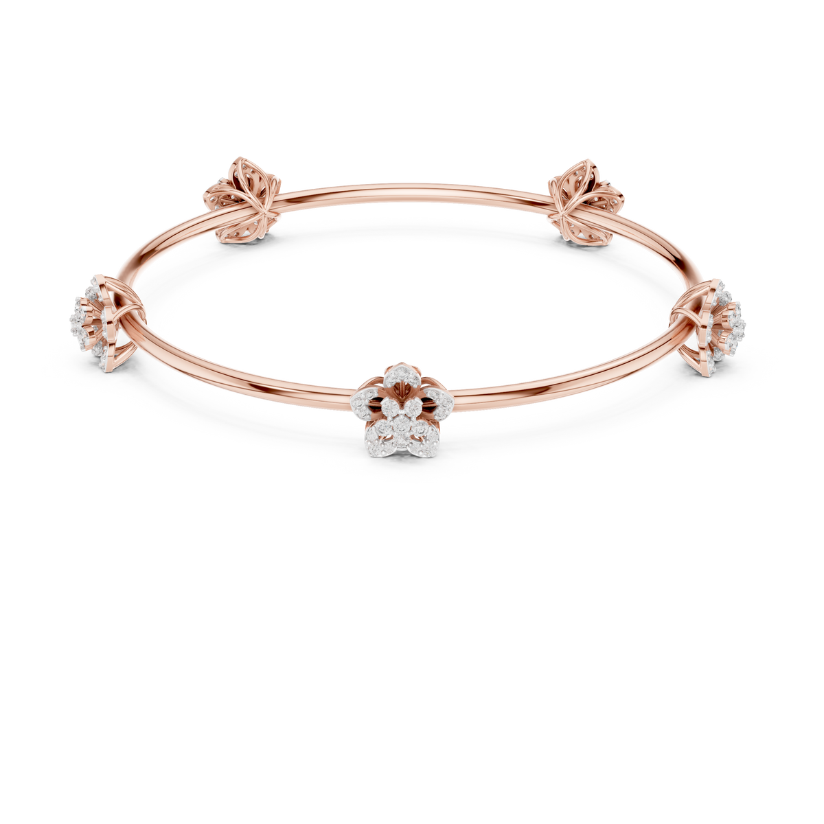 This elegant diamond bangle bracelet showcases a refined open silhouette adorned with graceful floral motif stations. Each station features round brilliant diamonds arranged in a delicate flower-inspired design, creating a harmonious balance of sparkle and sculptural detail. The slim, polished band flows smoothly around the wrist, offering a lightweight and fluid feel while maintaining a timeless, luxurious presence. The symmetrical placement of the floral stations enhances visual depth and refined brilliance from every angle.
