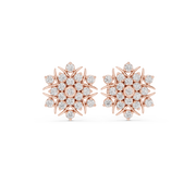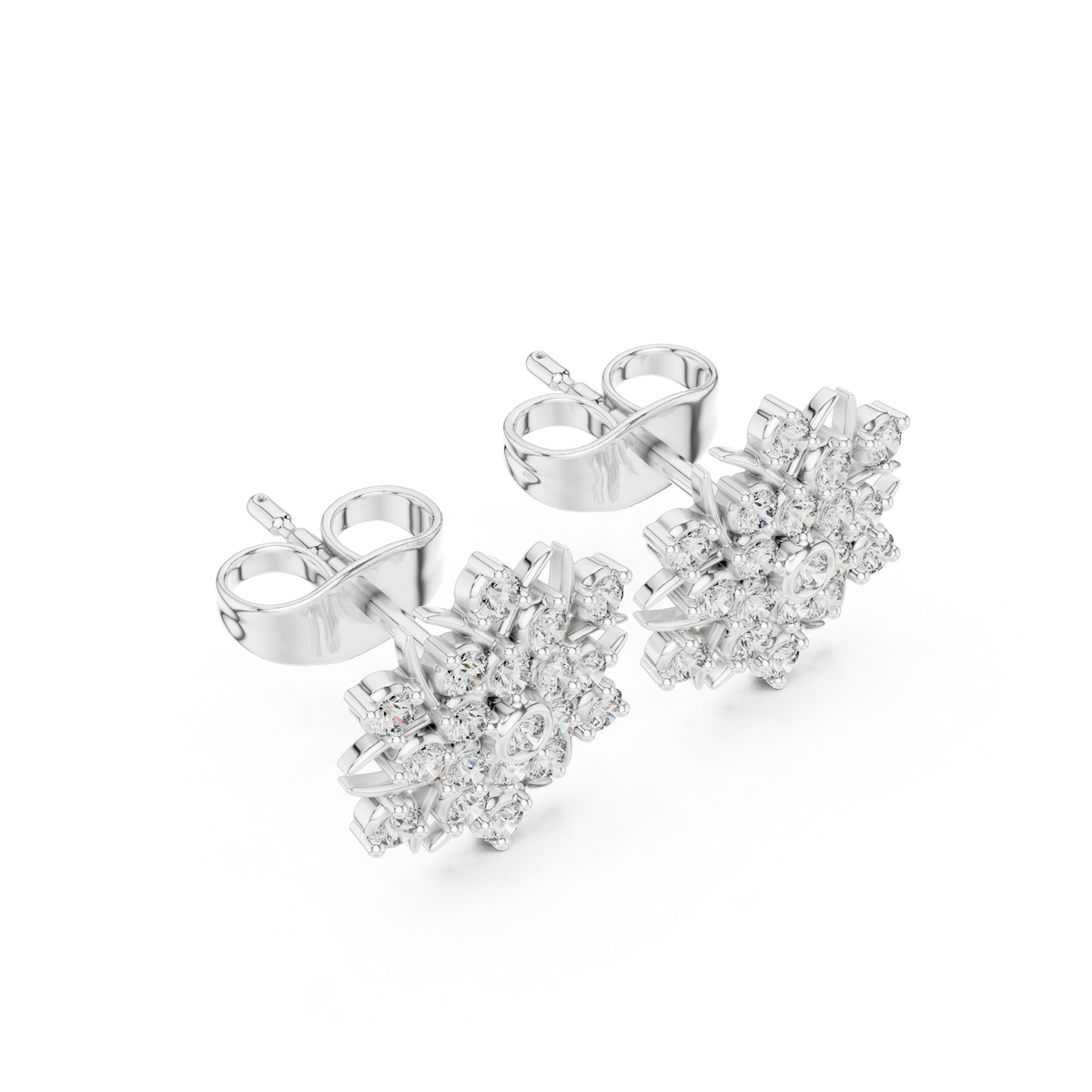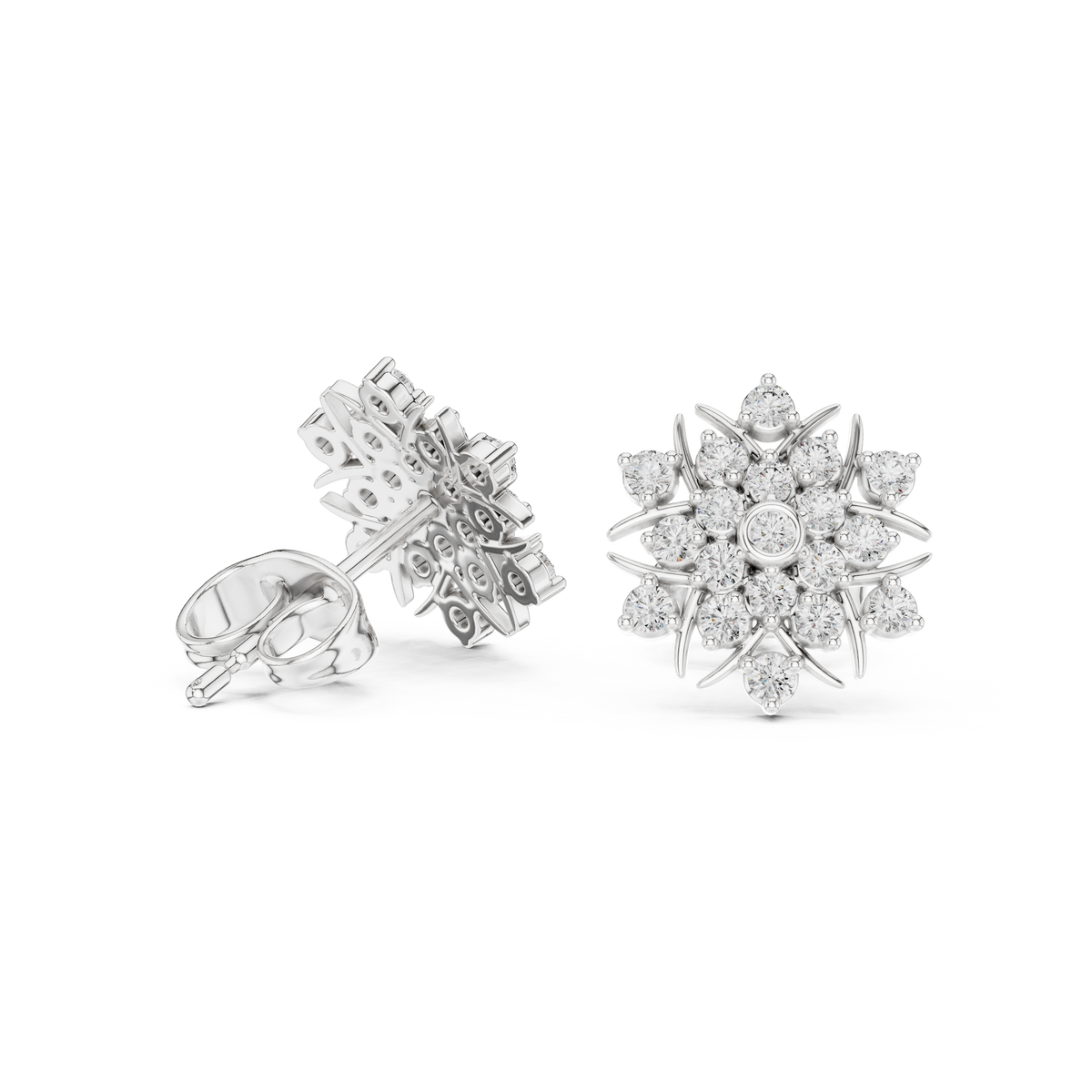 These statement stud earrings showcase a radiant floral sunburst design, crafted with concentric layers of round brilliant diamonds arranged in a bold, symmetrical cluster. The sculpted petal-like spokes add dimension and texture, creating a captivating play of light from every angle. Designed as classic studs, the earrings sit securely and comfortably on the ear, delivering eye-catching brilliance with refined polish and timeless elegance.